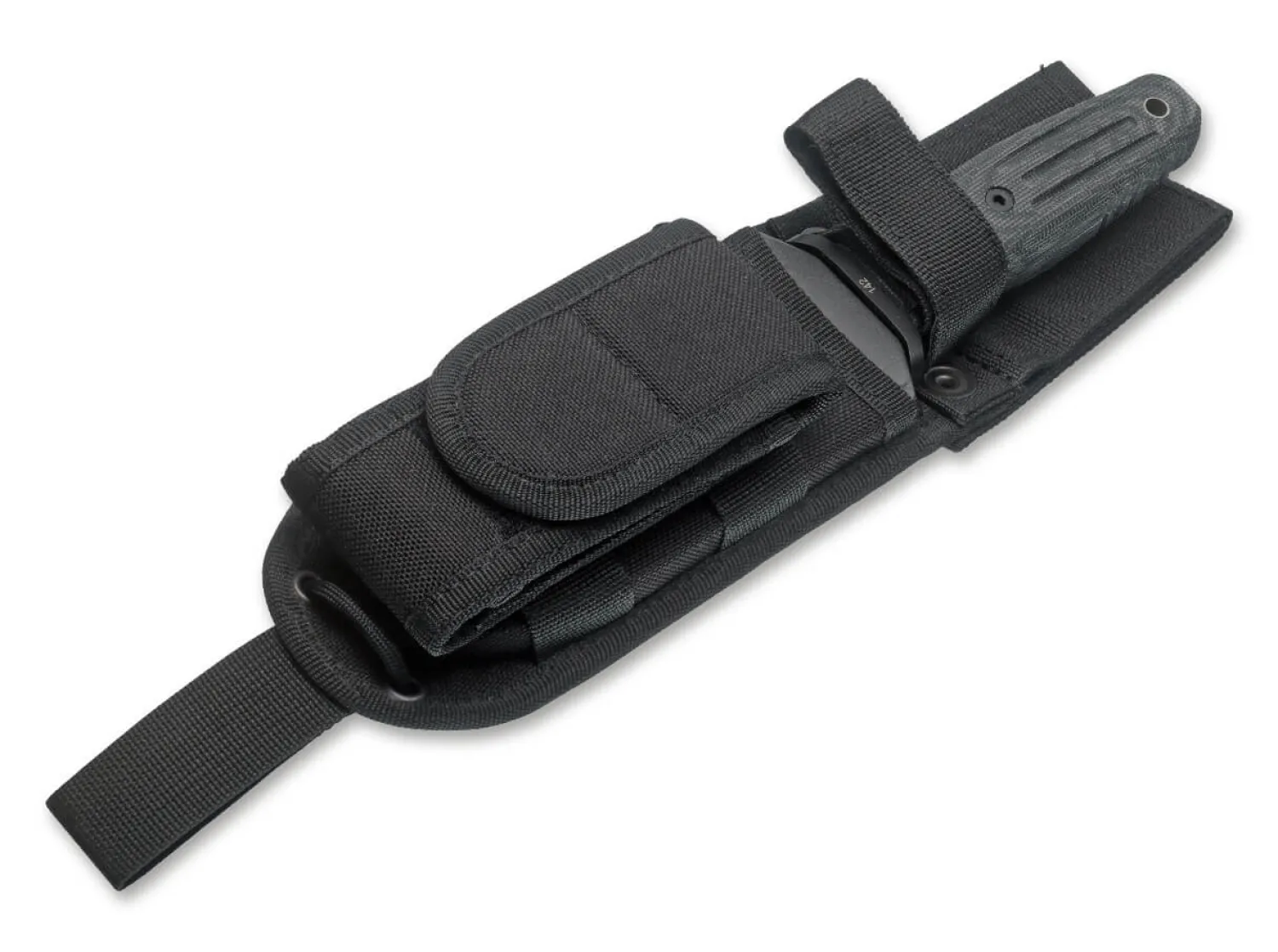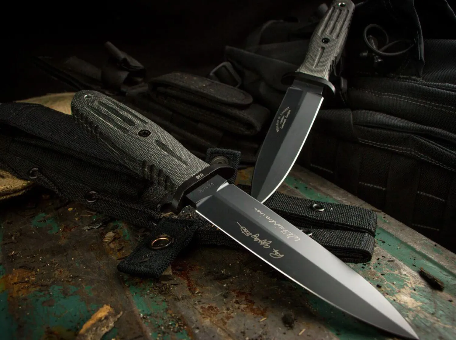 In der ganzen Vielfalt der Kampfmesser sind komplett geschwärzte Versionen quasi ein Muss. Nicht nur für militärische Operationen, sondern auch wegen der besonderen Ausstrahlung eines solchen Dolches und wegen des zusätzlichen Korrosionsschutzes, den die Beschichtung gewährleistet, sind die schwarz gehaltenen Versionen überaus populär. Und so war es quasi unsere Pflicht, auch die überarbeiteten Modelle A-F 4.5 und A-F 5.5 in einer solchen Variante aufzunehmen. Kaum ein anderer Messermacher hat das Feld der taktischen Einsatzmesser so sehr geprägt wie William H. „Bill“ Harsey, seine Entwürfe haben ihm einen ausgezeichneten Ruf in der Messerwelt eingebracht. Die von ihm entworfene Modifikation des legendären Böker Applegate-Fairbairn verbindet das von vielen Eliteeinheiten im Einsatz genutze Messer mit modernen Elementen. Die größere Klingenbreite und die günstigere Geometrie der beidseitig geschliffenen Klinge aus N690 mit schwarzer PVD-Beschichtung verbessern die Schneideigenschaften, während die Klingenlänge einen optimalen Kompromiss aus Führigkeit und Nutzwert bietet. Der am Griffende hervorstehende Klingenerl kann unter anderem als Glasbrecher eingesetzt werden. Die CNC-gefrästen Griffschalen aus schwarzem Micarta sind äußerst belastbar, angenehm strukturiert und bieten selbst bei Feuchtigkeit hervorragenden Grip. Lieferung mit hochwertiger schwarzer Nylonscheide von SpecOps.