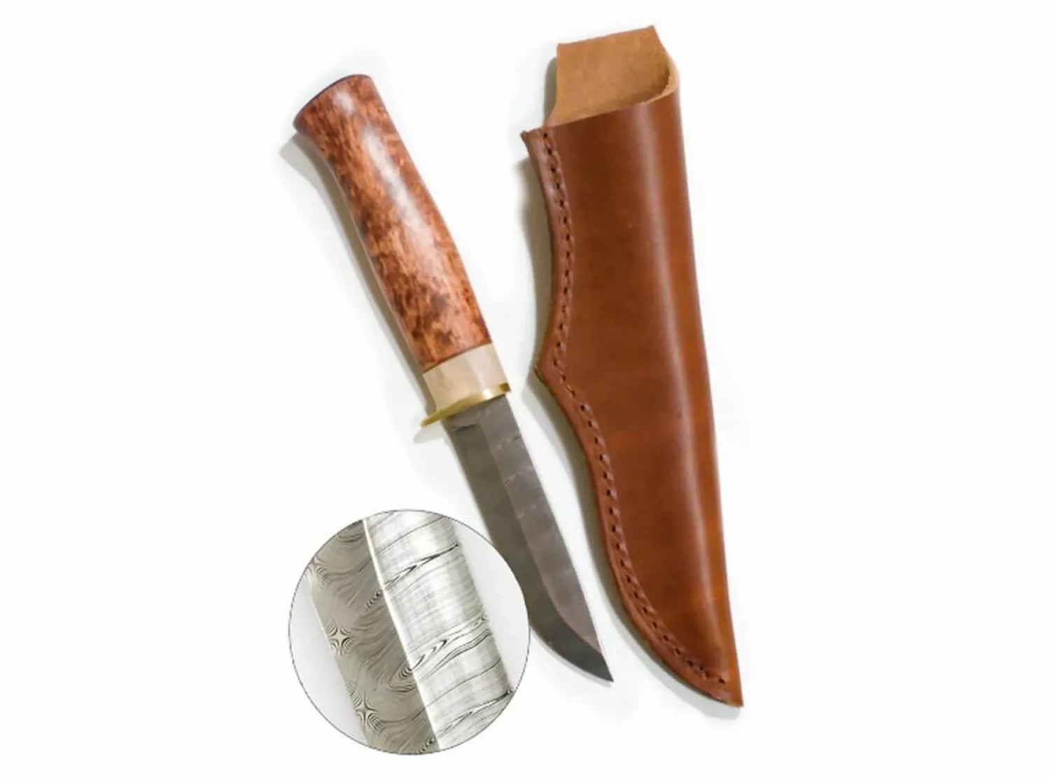 Messergriff aus geölter Maserbirke und Rentierhorn, Klinge 21×100 mm aus martensitisch gehärtetem Pulverstahl, 120-160 Lagen, gehärtet auf 58HRC. Messerscheide aus 3 mm starkem Rindsleder.