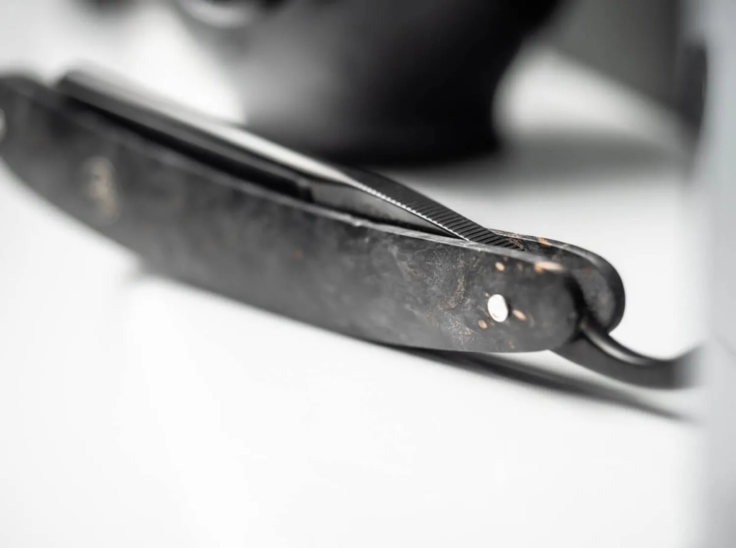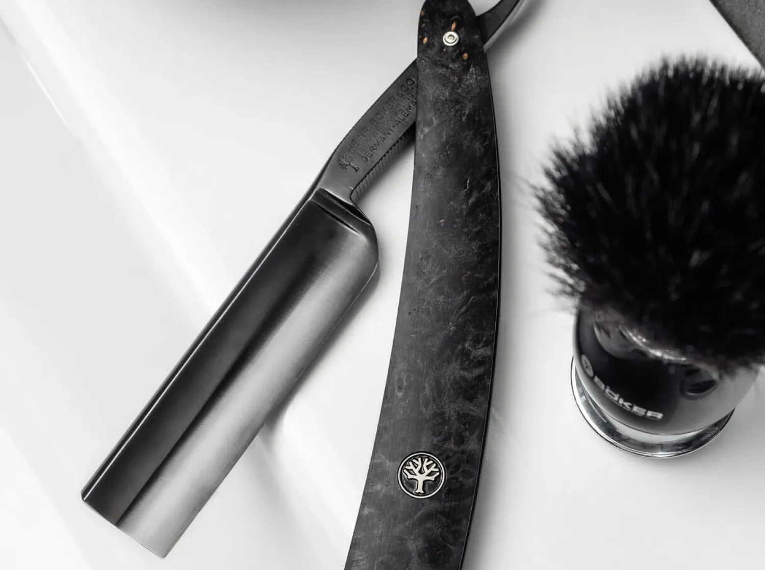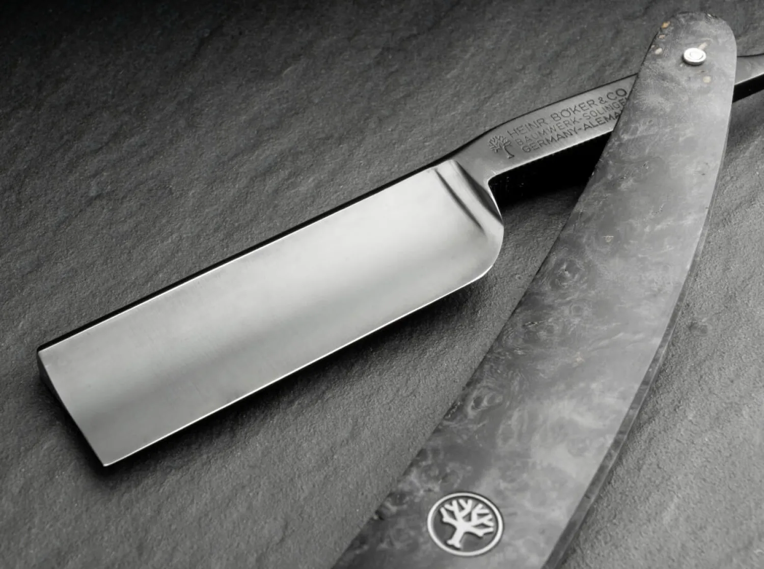 Stil ist weniger eine Frage der Eleganz, sondern vielmehr des Charakters. Dass sich diese Eigenschaften hervorragend vereinen lassen, beweist das Böker Black Amboina in Vollendung. Das ausdrucksstarke 6/8 Zoll Rasiermesser ist komplett in Schwarz gehalten und wird erstmalig mit einer brünierten Klinge aus hochfestem Kohlenstoffstahl versehen. Bei diesem besonderen Verfahren wird die Oberfläche der Klinge durch die Behandlung mit Säure in eine schwarze Oxidschicht umgewandelt, weswegen hierbei nicht von einer Beschichtung im klassischen Sinne gesprochen werden kann. Die extrahohl geschliffene Klinge erhält eine beidseitige Serrierung am Klingengang und unterstreicht somit den exklusiven Charakter des Böker Black Amboina. Durch das ausgewogene Gewicht des Messers gleitet die Klinge äußerst angenehm und sauber über die Haut.Das Heft aus exotischem Amboina Holz beeindruckt mit seiner auffällig zerstreuten Maserung, die in Teilen an wilde Kohlefaser erinnert. Diese besondere Struktur verdankt die aus Südostasien stammende Holzart seinen knollenartigen Verwachsungen im Bereich der Wurzeln, wodurch jedes Messer seinen einzigartigen Charakter erhält. Das markante Schwarz und die angenehm glatte Oberfläche des Hefts werden mit Hilfe der Stabilisierung des Holzes erreicht. Bei diesem speziellen Prozess wird erhitztes Epoxidharz in die Holzporen gepresst und anschließend ausgehärtet. Die bauchige Form des Hefts bildet einen gelungenen Kontrast zum Gradkopf der Klinge, womit die Linien des Rasiermessers ausdrucksstark betont werden.Diskrete optische Akzente im Heft finden sich als Blickfang in den beiden Nieten aus Neusilber sowie dem silbernen Böker Baumschild wieder. Mit authentischem Böker Stempel im Klingengang, Echtheitszertifikat und elegantem Schwebedisplay. Handgefertigt in der Böker Messer-Manufaktur Solingen.