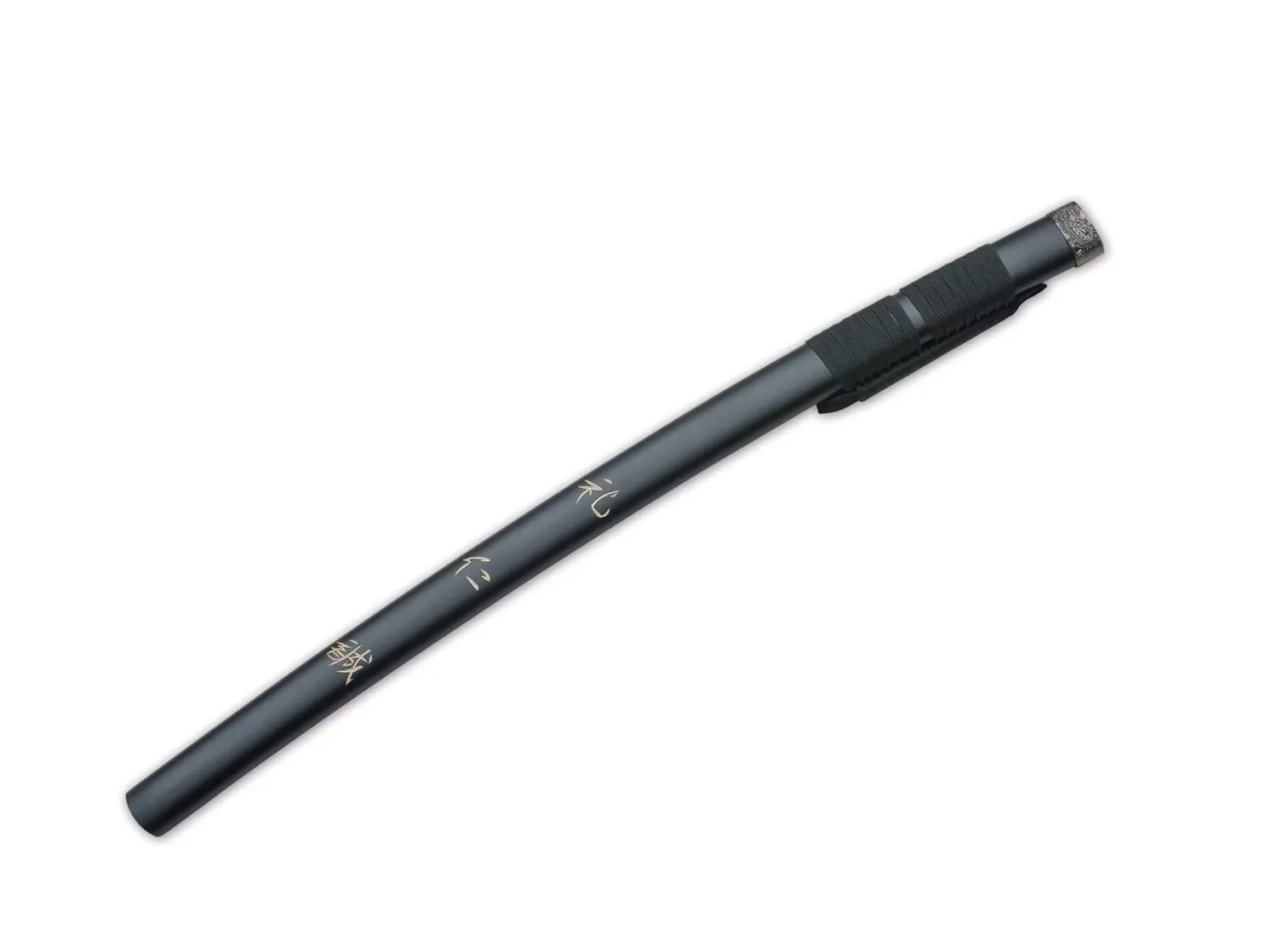 Das Magnum Black Samurai ist ein prunkvolles und reichhaltig verziertes Sammlerschwert, das der Blickfang Ihrer Kollektion werden könnte. Selbst in der hölzernen und schwarz lackierten Scheide macht das Black Samurai eine gute Figur. Die Scheide trägt die handgeschnitzten Kanji (Schriftzeichen) „Großzügigkeit, Mitgefühl und Aufrichtigkeit“. Wird das nicht scharf geschliffene Schwert mit der Kohlenstoffstahlklinge gezogen, so kann man weitere Kanji entdecken, die tief in die Klinge geprägt sind. Diese Zeichen bedeuten: „Seit dem Altertum ist Gott mit denjenigen, die mit Würde und Ehre dienen“. Die antrazitfarbene Tsuba und der traditionell gewickelte Griff runden das würdevolle Erscheinungsbild harmonisch ab. Inklusive Schwertständer aus Holz.Deko- bzw. Sammlerschwert, nicht zum Einsatz geeignet.