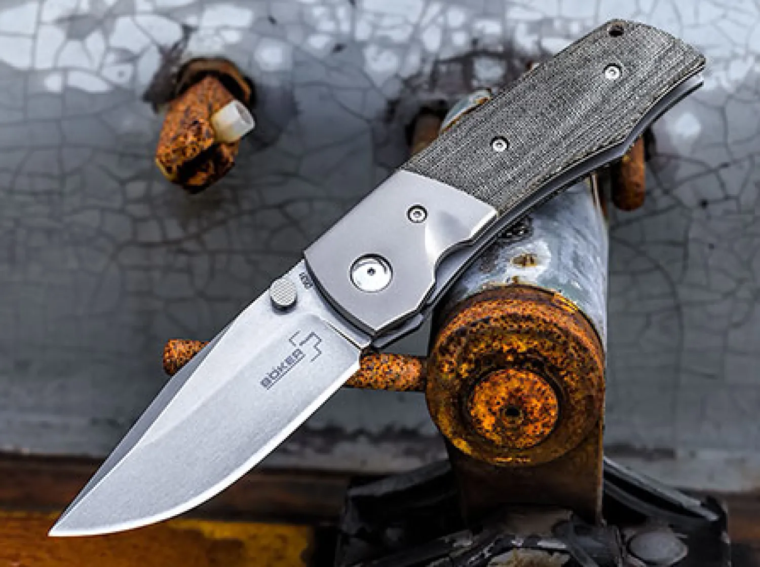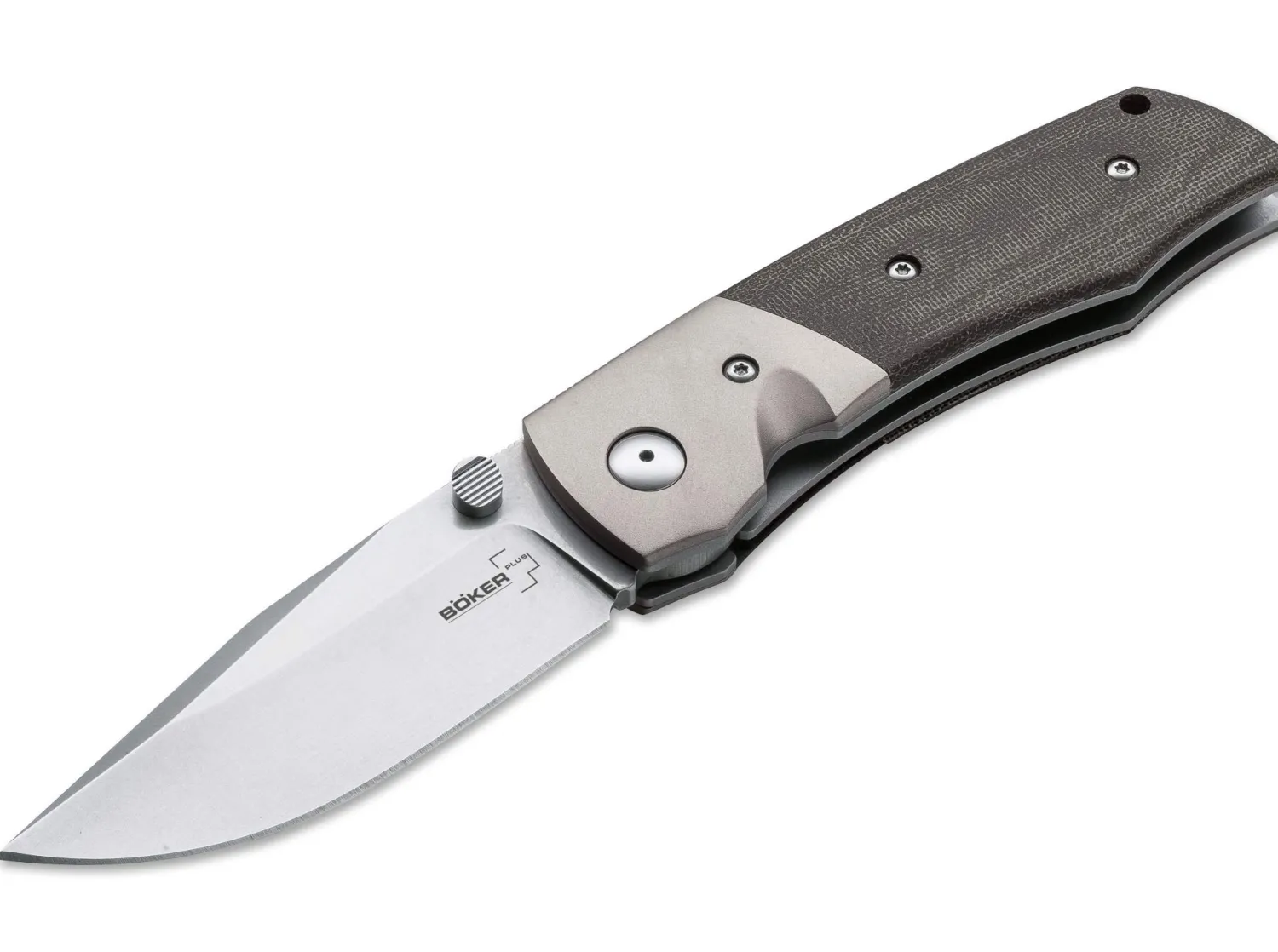 Kompakter als das Squail, aber dennoch in der gleichen Handschrift gezeichnet ist das Bullpup von Charles Marlowe. Die hohlgeschliffene Clippoint-Klinge, die auch beim Bullpup aus VG-10 gefertigt wird, ist gedrungen, aber dennoch elegant, und die Linienführung des ganzen Messers verrät die kundige Hand von Charles Marlowe. Auch das Bullpup ist mit einem Linerlock mit Edelstahlplatinen sowie Titanbacken ausgestattet, und der kurze Clip ist umsetzbar (Tipup/ Tip-down). Die Beschalung aus gestrahltem Leinenmicarta trägt ihren Teil zur Griffigkeit ebenso bei wie die Daumenriffelung auf Griff und Klinge. Kompakt, kräftig, effektiv und führig – Bullpup!