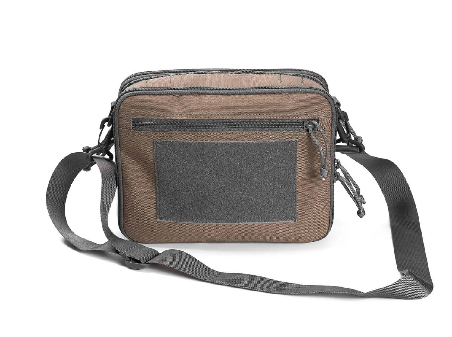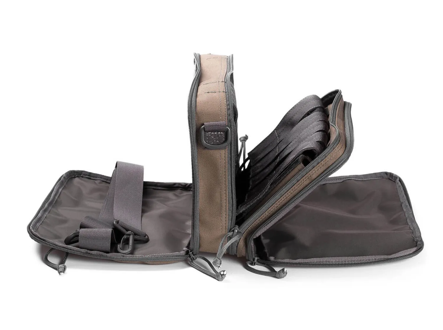Die taktische Tasche aus robustem und wasserfestem Nylon bietet Platz für ein Laptop oder andere elektronische Kleingeräte. Der Clou sind die 10 außen anbringbaren Messertaschen (je 13 x 5 cm), die per Klettverschluss befestigt werden können. Darüber hinaus kann die komplette Tasche auch auf Links benutzt werden. Der Schulterriemen erlaubt ein flexibles und angenehmes Tragen der braunen Tasche. Abmessungen: 27 cm (L) x 21,5 cm (H) x 10 cm (T).