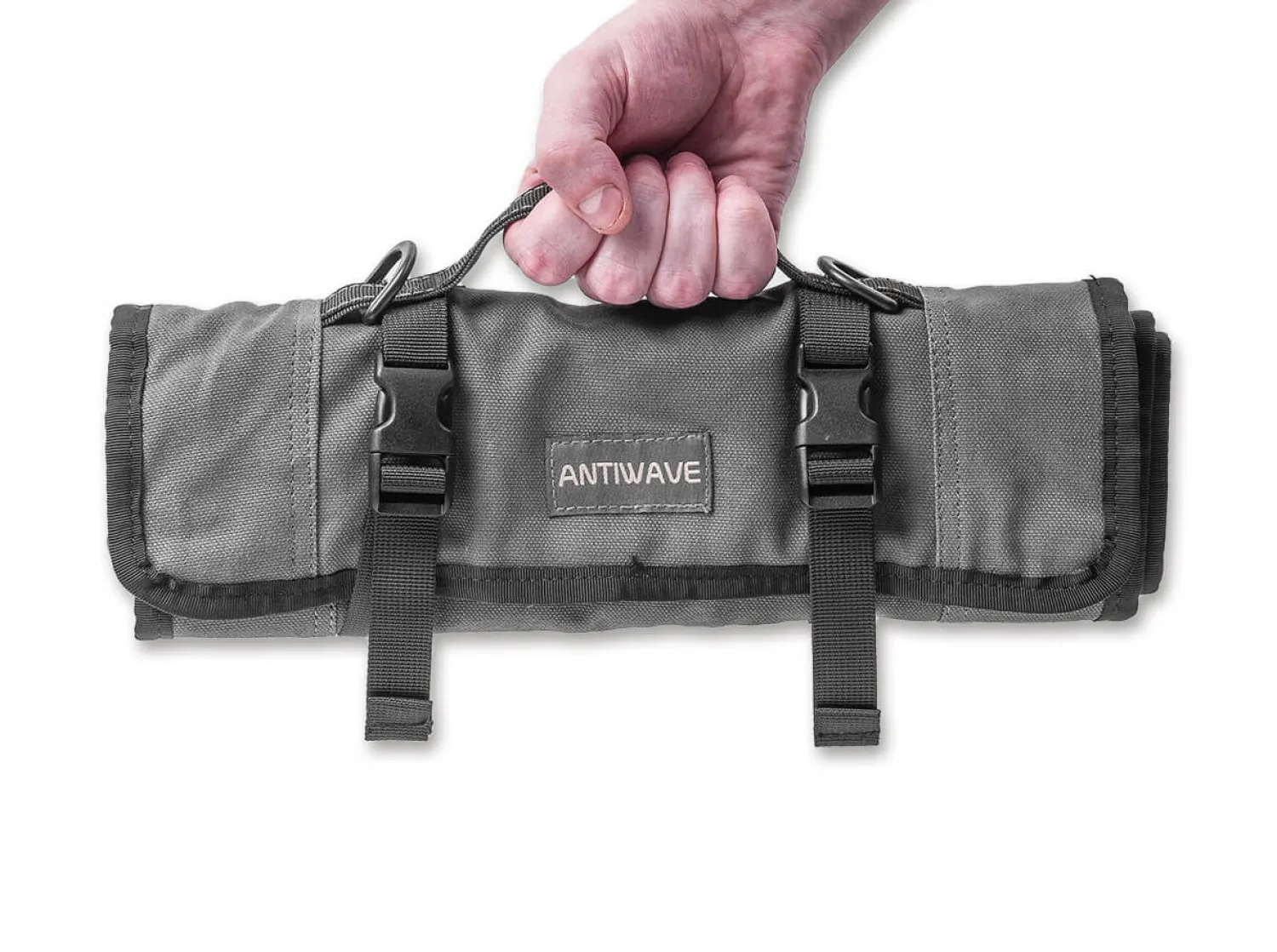 Die praktische Rolltasche kann bis zu 14 Messer oder kleine Werkzeuge unterbringen. Zusätzlich verbirgt sich im Inneren der gepolsterten Tasche noch ein Kochmesserfach. Das graue Nylonmaterial ist sehr robust und wasserabweisend.