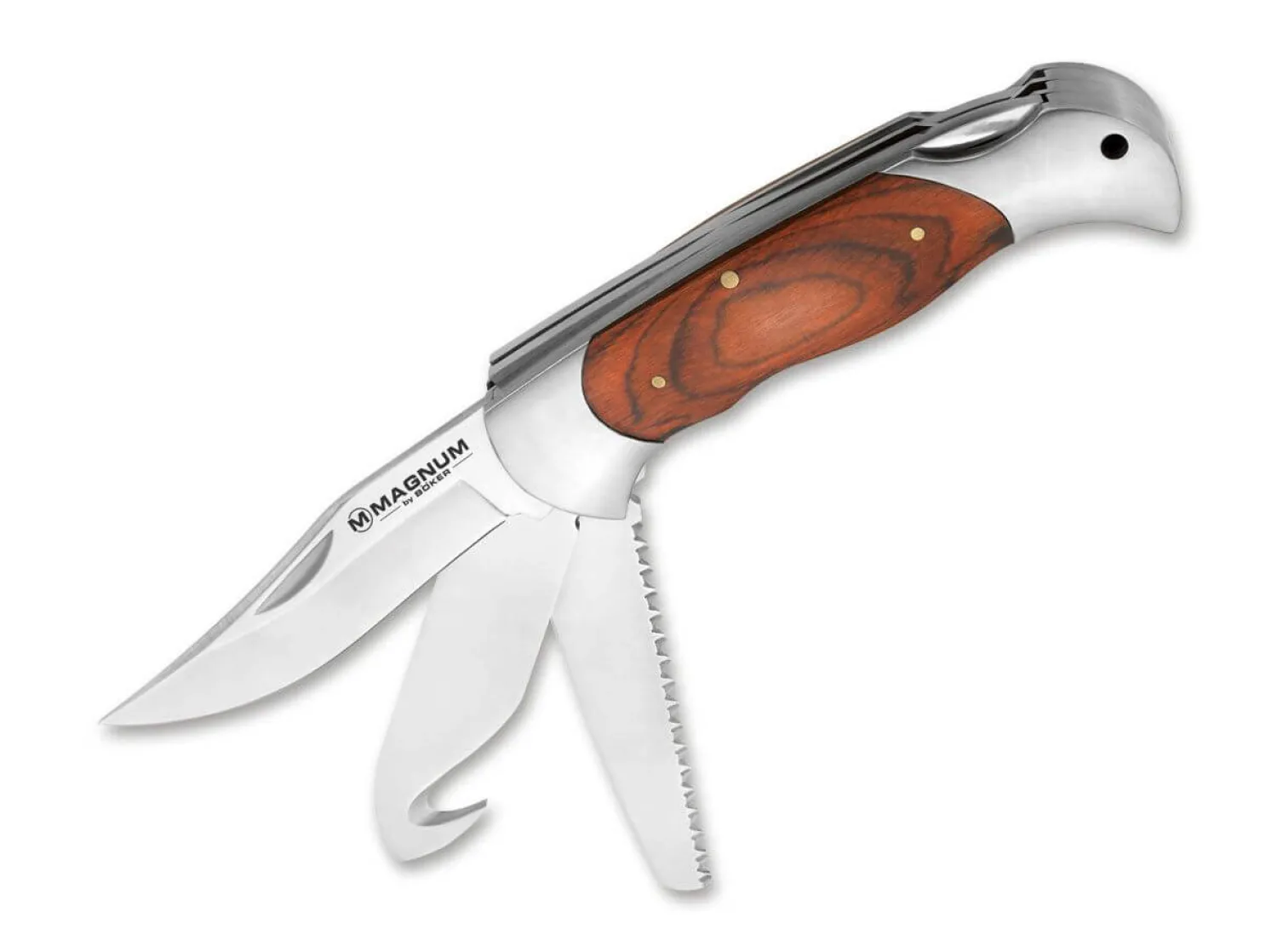 Das Magnum Classic Hunter ist ein traditionelles Jagdtaschenmesser par excellence. Alle drei Klingen werden aus 440A gefertigt und sind einzeln über den Backlock arretierbar. So wird ein unbeabsichtigtes Einklappen der Klinge verhindert. Das Messer verfügt über eine robuste Clippoint-Klinge, einen Aufreisshaken und eine Holz- und Knochensäge. Die schöne Holzbeschalung steht im Kontrast zu den kühlen Edelstahlbacken und rundet das Erscheinungsbild ab. Ein vielseitiges Messer für die nächste Jagd-, Trekking oder normale Tagestour.