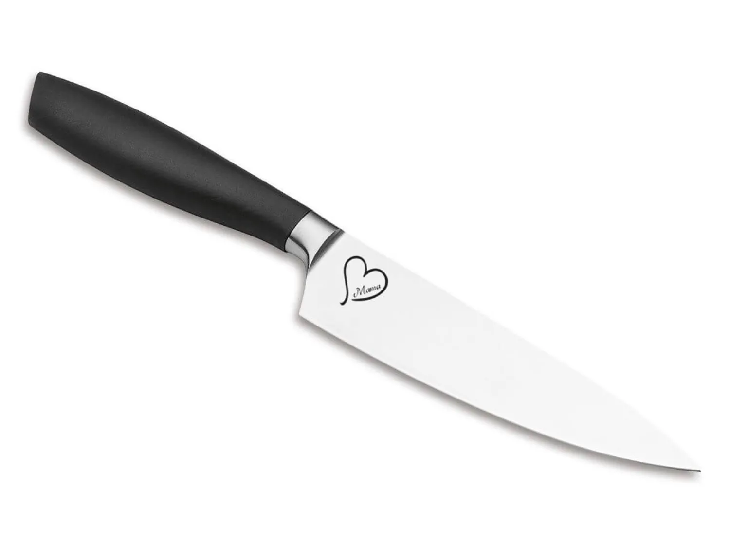 Was haben Trier, Wiesbaden, Münster und Lüneburg gemeinsam? Neben historischen Stadtkernen, überregionalen Sehenswürdigkeiten und einer langen Tradition als bedeutende Handelsstädte vor allem eines: Sie beherbergen exzellent geführte Stahlwarenhändler, die sich durch ein breites Warenangebot und eine hohe Fach- und Beratungskompetenz seit vielen Jahren einen Namen gemacht haben.Die jahrzehntelange Erfahrung, das ausgezeichnete Know-How und das tagtäglich im Geschäftsalltag bewiesene Gespür für die Anforderungen und Bedürfnisse von koch- und küchenbegeisterten Kunden haben wir uns zunutze gemacht und gemeinsam mit unserer fast 150-jährige Erfahrung als Solinger Messermanufaktur in die Produktentwicklung der Böker Core Professional Serie fließen zu lassen. Entstanden ist ein Produkt, welches sich aufgrund der dynamischen Linienführung, dem hervorragenden Handling und der atemberaubenden Schneidfähigkeiten das Prädikat „Empfohlen von führenden Fachhändlern“ mehr als verdient hat.Der massive Klingenrohling aus der für hochwertige Küchenmesser exzellent geeigneten Chrom-Molybdän-Vanadium- Legierung (X50CrMoV15) wird durch die aufwändige Schmiedung in Solinger Handarbeit zusätzlich im Gefüge optimiert und anschließend auf 58 HRC gehärtet. Für eine längere Standzeit der Klinge und ein noch feineres Schnittbild wird der bei uns übliche traditionelle Handabzug zusätzlich hochglanzpoliert.Der geschmiedete Kropf bietet jederzeit einen sicheren Griff und schützt bei einem Abrutschen vor möglichen Verletzungen. Als besonderes Design-Feature ist der Klingenrücken bei allen Messern dieser Serie sanft abgerundet. So liegt das Messer in jeder Griffposition angenehm in der Hand und verhindert auch bei stärkerem Druck auf den Klingenrücken im Wiegeschnitt ein unangenehmes Druckgefühl in der Hand.Die praktischen und perfekt proportionierten Griffe aus Kunststoff vervollständigen das stimmige Gesamtbild. So sind die Messer im höchsten Maße feuchtigkeitsresistent und können auch in der professionellen Gastronomie bedenkenlos eingesetzt werden. Denn gerade in der Küche hat die Hygiene jederzeit höchste Ansprüche zu erfüllen.Das Kochmesser zählt zu den wichtigsten Messern in der Küche und gehört zur Grundausstattung. Es hat eine etwas breitere und längere Klinge als das Allzweckmesser. Die schlanke Spitze eignet sich ausgezeichnet dazu Zwiebeln oder kleines Gemüse zu schneiden. Dank seine Länge, kann man es aber auch hervorragend als Fleischmesser benutzen. Auch große Gemüsesorten lassen sich problemlos damit verarbeiten.Jedes Jahr aufs Neue machen sich Millionen Kinder in Deutschland und auf der ganzen Welt darüber Gedanken, was sie ihren Müttern zum Muttertag schenken könnten. Das kleine Kochmesser ist in der Muttertagsvariante mit einer zusätzlichen Lasergravur versehen, denn persönliche Geschenke sind stets etwas ganz besonderes.