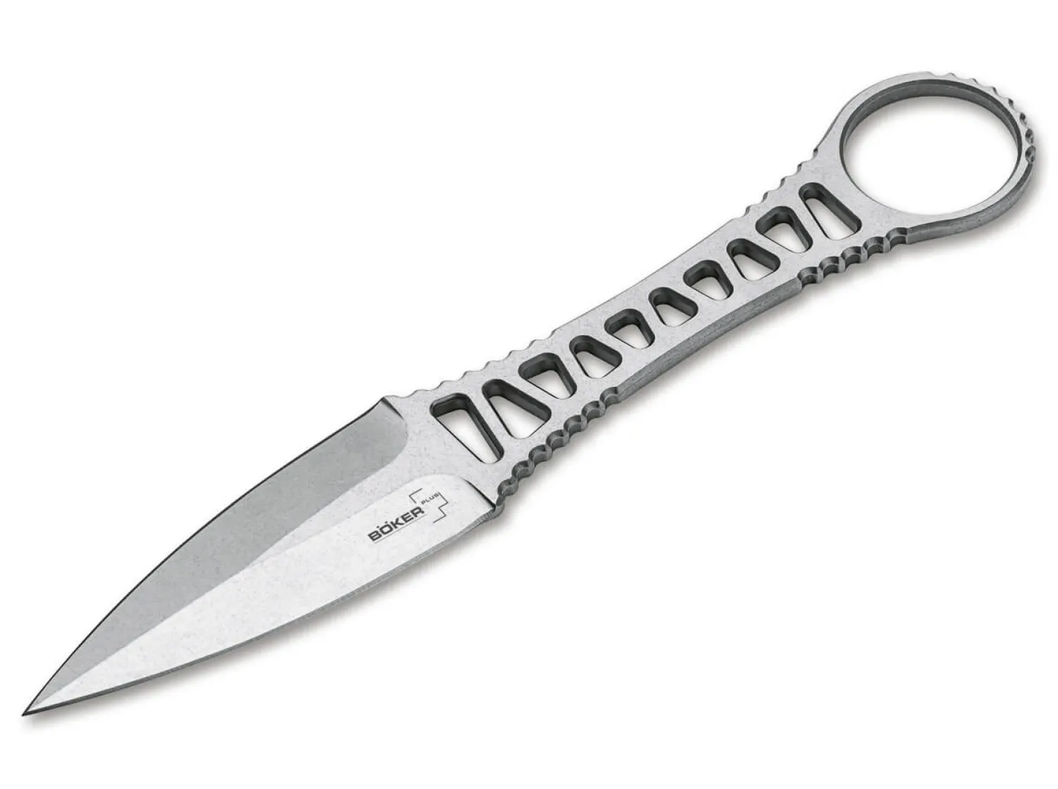 Die für Peter Fegan charakteristische Skelettbauweise verleiht dem Böker Plus Delta seine einzigartige Präsenz. Der große Griffring gewährleistet im Zusammenspiel mit den ausgeprägten Griffrillen in den relevanten Bereichen ein geradezu spektakuläres Handling, nicht nur im Standard-Griff, sondern auch im Reverse-Grip. Die beidseitig abgezogene Klinge macht das Delta zu einem Einsatzmesser auch für kritische Lagen. Getragen wird der Dolch in der im Lieferumfang enthaltenen Kydexscheide samt Gürteladapter, wobei die schlanke Bauweise und das geringe Gewicht auch einen Einsatz als Neck Knife denkbar machen. Die Ganzstahlkonstruktion besteht aus 440C und ist mit einem Stonewash-Finish versehen.
