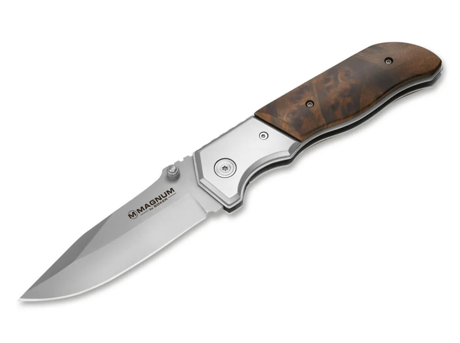 Mit dem wuchtigen, imposanten Magnum Forest Ranger können auch schwere Arbeiten spielend leicht erledigt werden. Die fein gestrahlte Clip-Point Klinge aus 440A wird durch einen Linerlock vor versehentlichem Einklappen geschützt. Die Edelstahlbacken und die großzügige Wurzelholzbeschalung machen das Messer zu einem echten Schmuckstück. Das Holz passt farblich perfekt zu seiner Umgebung und ist für den Outdoor-Bereich perfekt geeignet. Durch den mit drei Schrauben befestigten Hosenclip bleibt das Messer bis zum nächsten Einsatz stets griffbereit.