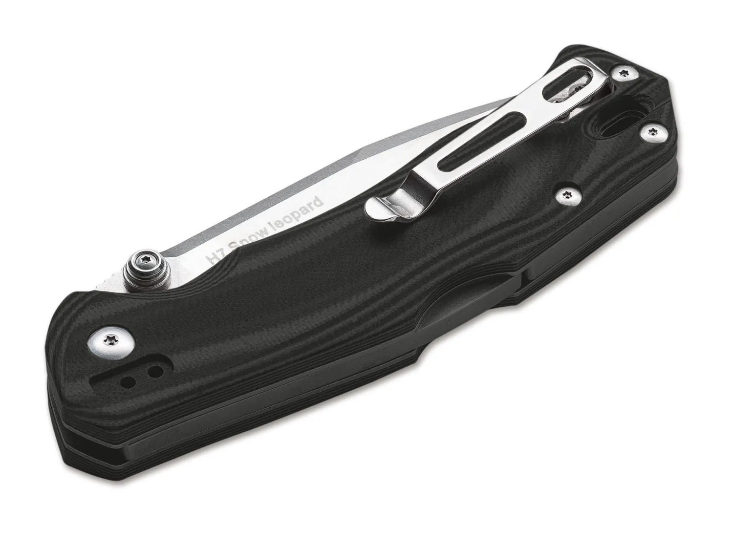 Die Beschalung aus gemasertem G10 verleiht dem Snow Leopard seine besondere Anmutung. Die Klinge verriegelt per Backlock. Als Klingenstahl kommt der stickstofflegierte Sandvik 14C28N zum Einsatz. Mit dreifach umsetzbarem Clip.
