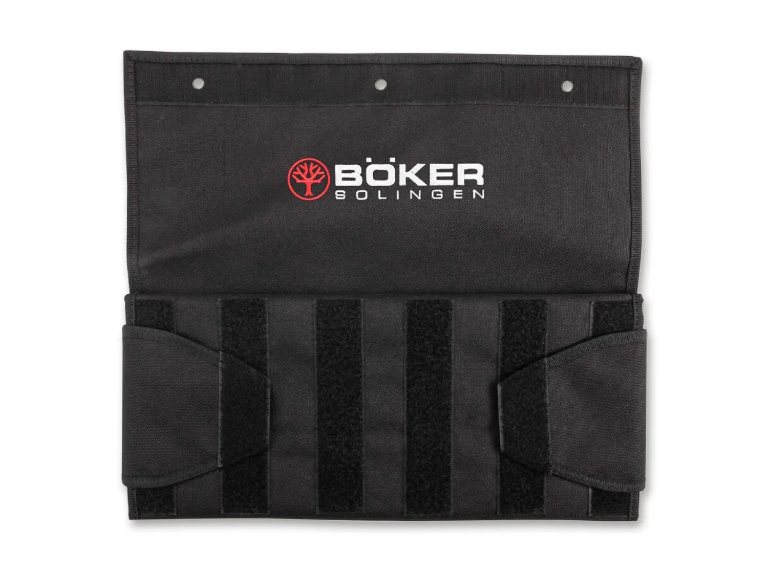Ordnung ist das halbe Leben – die andere Hälfte übernimmt die praktische Böker Knife Vault mit Fenstern. Um die wertvolle Taschen-messersammlung für Aufbewahrung oder Transport sicher vor Kratzern, Scheuerstellen und Schmutz zu schützen, bietet die Messertasche 18 voneinander getrennte Fächer mit Sichtfenster. Die äußeren Fächer sind extra breit gehalten, um auch größere Folder problemlos unterbringen zu können. Die große Klettverschlusslasche ist mit drei Hohlnieten versehen, so dass die Messerfalttasche an der Wand aufgehangen werden kann, um bis zu 18 Taschenmesser repräsentativ in Szene zu setzen. Ein per Klett abnehmbarer Halter auf der Rückseite bietet Platz für Visitenkarte oder Merkzettel, während die Klettfläche alternativ für Patches benutzt werden kann. Das aufwendig gestickte Böker Logo rundet das diskrete Erscheinungsbild der schwarzen Messertasche formschön ab. Alles im Blick und alles en chic – ein Muss für jeden Messersammler. Außenmaße: Breite 40 cm x Höhe 18 cm.