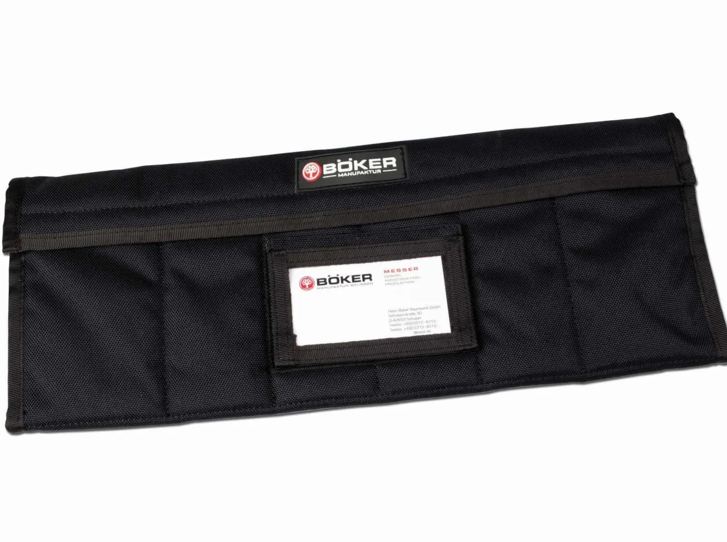 Überarbeitete Version, u.a. mit noch hochwertiegerem Innenfutter für schonendste Aufbewahrung und mit 3D Rubber-Logo. Die Böker Messertaschen bieten dem Sammler endlich eine sichere und angemessene Aufbewahrungs- und Transportmöglichkeit für seine wertvollen Klappmesser. Die Taschen bieten einzelne, komplett voneinander getrennte Fächer, so dass auch bei voller Belegung die Messer nicht in Kontakt kommen und eventuell verkratzen können. Ein weiches Innenfutter verhindert Scheuerstellen o.ä. Die äußeren Fächer sind extra breit gehalten, um auch größere Folder problemlos unterbringen zu können. Mit Klettverschlusslasche und per Klett abnehmbarem Halter für Visitenkarten oder Merkzettel. Klettfläche auch für Patches nutzbar. Schwarz. Für 12 Messer. Breite 40 cm. Höhe 16 cm.
