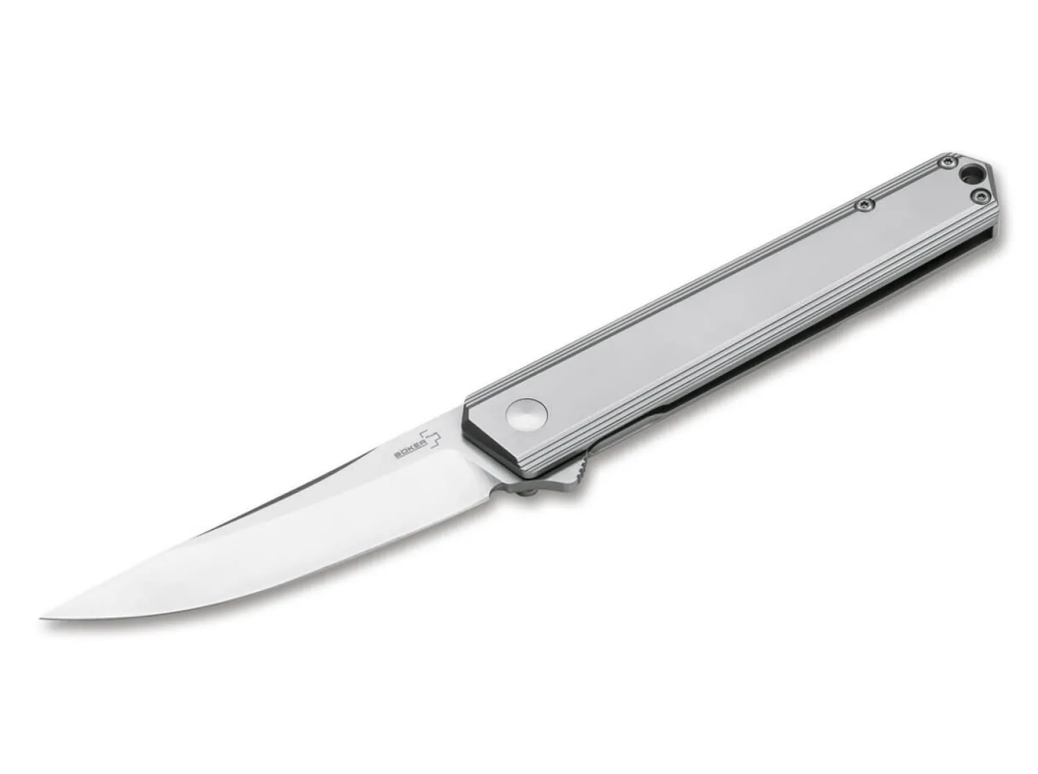 Die ungebrochene Popularität des Kwaiken Flippers von Lucas Burnley hat uns bereits eine Vielzahl von Varianten beschert. Ganz oben auf der Wunschliste unserer Kunden stand eine besonders schlanke Version, die bei gleichbleibender Größe noch mehr Tragekomfort bietet. So haben wir uns zusammen mit Lucas Burnley an die Verwirklichung des Böker Plus Kwaiken Framelock gemacht. Durch den Verzicht auf eine separate Platine konnten wir die griffdicke des Kwaiken hier noch einmal deutlich reduzieren. Durch die elegante Facettenfräsung der Edelstahlgriffschalen wirkt das Messer dennoch nie kantig in der Hand, sondern begeistert mit einer ausgezeichneten Haptik. Die kugelgelagerte Klinge wird aus D2 gefertigt und trägt ein feines Satin-Finish. Der sanft mattierte Griff trägt einen abnehmbaren Clip (Tip-up/r).
