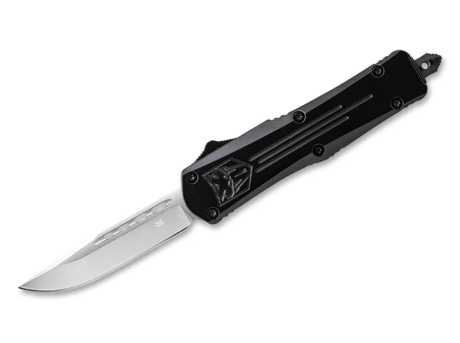 Achtung!Dieser Artikel ist ausschließlich für den Export in zugelassene Märkte bestimmt. Es handelt sich um einen verbotenen Gegenstand gemäß deutschem Waffengesetz. Der Vertrieb in und die Einfuhr nach Deutschland sowie jeglicher Umgang mit diesem Produkt in Deutschland ist verboten. Die Abgabe erfolgt nur an berechtigte Personen, jede Bestellung wird manuell geprüft! Bestellungen aus nicht zugelassenen Märkten werden ohne Rückmeldung gelöscht. Aufgrund der besonderen Rechtslage müssen wir diesen Artikel getrennt von anderen Artikeln versenden, wodurch höhere Portokosten entstehen können.Das ausgewachsene CobraTec Large FS-3 OTF Black überzeugt mit seiner Klinge aus D2 und dem strukturierten Griff aus Aluminium. Die Klinge kommt via Knopfdruck automatisch aus dem vorderen Griffstück (out the front) heraus. Mit Nylon Etui, Glasbrecher und Clip (Tip-down/r).