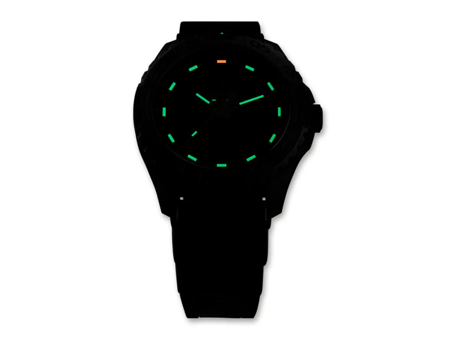 Die Traser P96 OdP Evolution ist der ideale Zeitmesser für Entdecker und Outdoor-Enthusiasten, der bei keinem Abenteuer fehlen darf. Extrem leicht, zäh und robust – diese Eigenschaften charakterisieren die sportliche P96 Outdoor Pioneer am besten. Zusätzliche Robustheit verleiht der P96 ein widerstandsfähiges glasfaserverstärktes Polymer-Gehäuse. Die Ablesbarkeit bei Nacht ist durch die hauseigene Selbstleuchttechnologie trigalight jederzeit gewährleistet.Die Uhr hat einen Durchmesser von 44 Millimetern und ist mit anti-reflektierendem, kratzfestem Saphirglas und einem Original Swiss Made Quarz Uhrwerk ausgestattet. Die hellen Ziffern und Uhrzeiger sitzen auf einem schwarzen Ziffernblatt. Das schwarze Kautschuk-Armband ist angenehm zu tragen. Die Uhr verfügt über eine Stoppfunktion und ist wasserdicht bis 20 bar oder 200 Meter. Die trigalight Selbstleuchttechnologie erleuchtet Index 1 bis 11 in grüner Farbe und Index 12 in orangener Farbe. Zusätzlich ist die einseitig drehbare Lünette mit Super-LumiNova beschichtet.