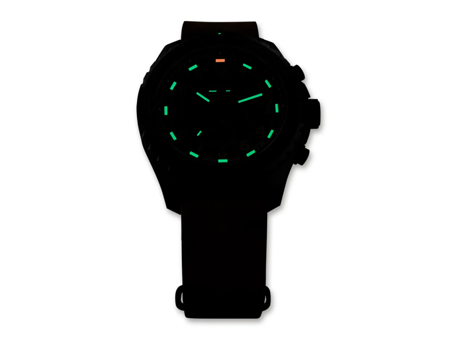 Die Traser P96 OdP Evolution ist der ideale Zeitmesser für Entdecker und Outdoor-Enthusiasten, der bei keinem Abenteuer fehlen darf. Extrem leicht, zäh und robust – diese Eigenschaften charakterisieren die sportliche P96 Outdoor Pioneer am besten. Zusätzliche Robustheit verleiht der P96 ein widerstandsfähiges glasfaserverstärktes Polymer-Gehäuse. Die Ablesbarkeit bei Nacht ist durch die hauseigene Selbstleuchttechnologie trigalight jederzeit gewährleistet.Die Uhr hat einen Durchmesser von 44 Millimetern und ist mit anti-reflektierendem, kratzfestem Saphirglas und einem Original Swiss Made Quarz Chrono Uhrwerk ausgestattet. Die grünen Ziffern und Uhrzeiger sitzen auf einem petrolfarbenen Ziffernblatt. Das hochwertige Leder-Armband ist angenehm zu tragen. Die Uhr verfügt über eine Stoppfunktion und ist wasserdicht bis 20 bar oder 200 Meter. Die trigalight Selbstleuchttechnologie erleuchtet Index 1 bis 11 in grüner Farbe und Index 12 in orangener Farbe. Zusätzlich ist die einseitig drehbare Lünette mit Super-LumiNova beschichtet.