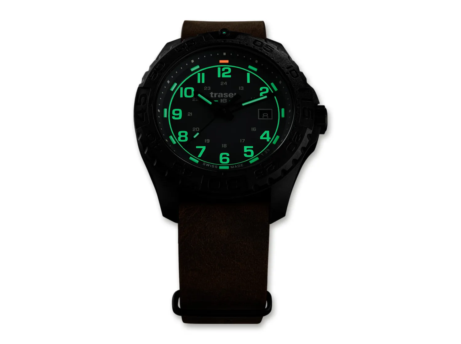 Die Traser P96 OdP Evolution ist der ideale Zeitmesser für Entdecker und Outdoor-Enthusiasten, der bei keinem Abenteuer fehlen darf. Extrem leicht, zäh und robust – diese Eigenschaften charakterisieren die sportliche P96 Outdoor Pioneer am besten. Zusätzliche Robustheit verleiht der P96 ein widerstandsfähiges glasfaserverstärktes Polymer-Gehäuse. Die Ablesbarkeit bei Nacht ist durch die hauseigene Selbstleuchttechnologie trigalight jederzeit gewährleistet.Die Uhr hat einen Durchmesser von 44 Millimetern und ist mit anti-reflektierendem, kratzfestem Saphirglas und einem Original Swiss Made Quarz Uhrwerk ausgestattet. Die grünen Ziffern und Uhrzeiger sitzen auf einem petrolfarbenen Ziffernblatt. Das hochwertige Leder-Armband ist angenehm zu tragen. Die Uhr verfügt über eine Stoppfunktion und ist wasserdicht bis 20 bar oder 200 Meter. Die trigalight Selbstleuchttechnologie erleuchtet Index 1 bis 11 in grüner Farbe und Index 12 in orangener Farbe. Zusätzlich ist die einseitig drehbare Lünette mit Super-LumiNova beschichtet.