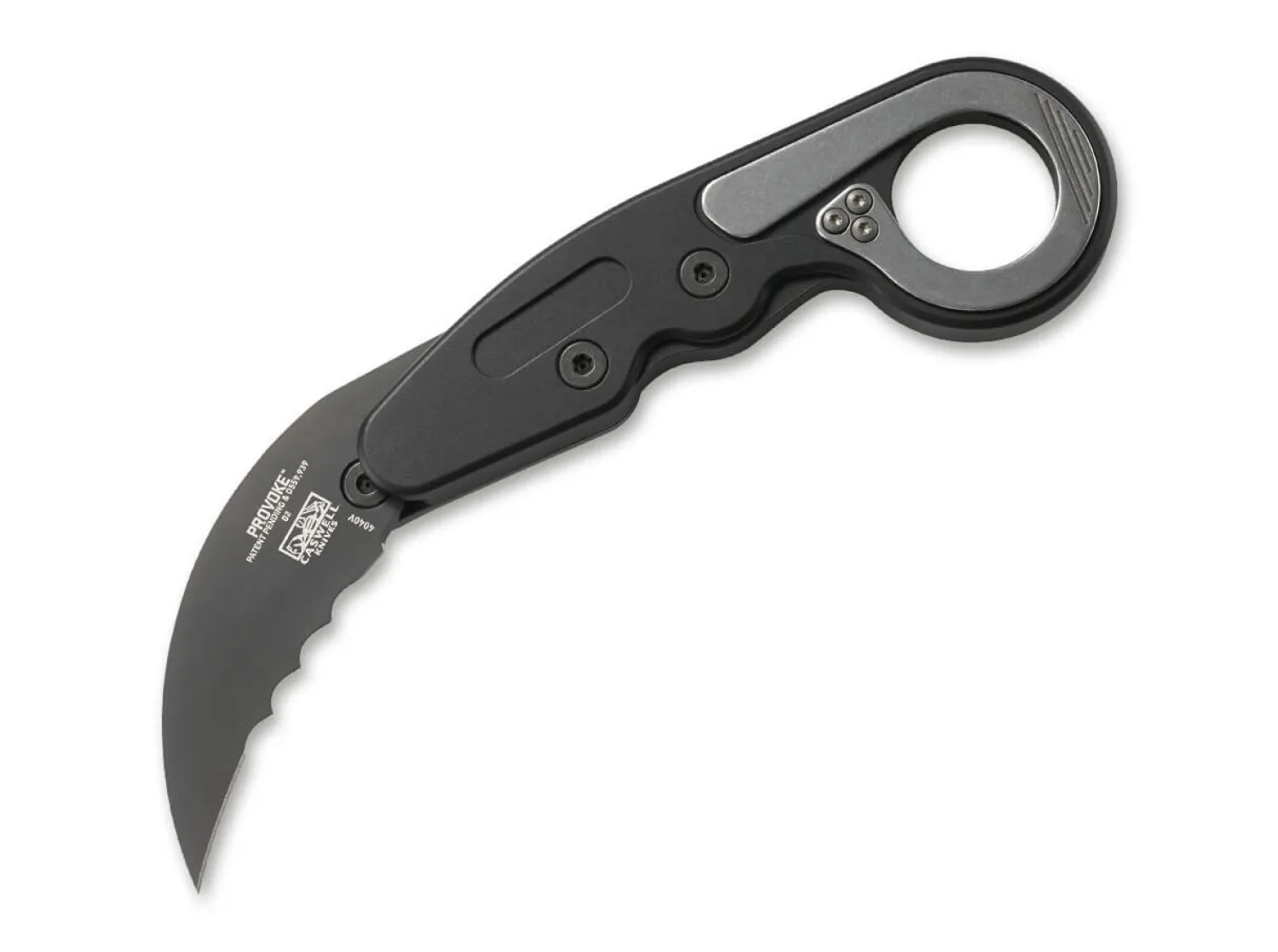 Eine ganz neue Dimension von Klappmesser stellt das CRKT Provoke von Joe Caswell dar, dessen Kinematic genannter Mechanismus mit dem keines anderen Taschenmessers vergleichbar ist. Die auf zwei beweglichen Armen gelagerte Hawkbill-Klinge dreht sich nicht klassisch um eine Achse, sondern wird vom Griff parallel nach vorne herausgeschwenkt und verriegelt. Die Verriegelung des Kerambits wird mit dem in Griff eingelassenen Hebel wieder gelöst. Die Bedienung ist so unkompliziert und intuitiv, dass stets ein sicheres und schnelles Handling gewährleistet ist.Die Griffelemente werden aus 6061 T6-Aluminium gefertigt, während die titannitridbeschichtete Klinge mit Teilwellenschliff aus D2 besteht und beeindruckende 5,3 Millimeter stark ist. Der runde Clip trägt im Gebrauch des Messer nicht auf, lässt sich jedoch mit leichtem Fingerdruck aus seiner Parkposition holen, um das Messer wegzustecken. Das einzigartige Konzept des Provoke beweist anschaulich, dass auch im Bereich der Klappmesser noch grundlegende Innovationen möglich sind.