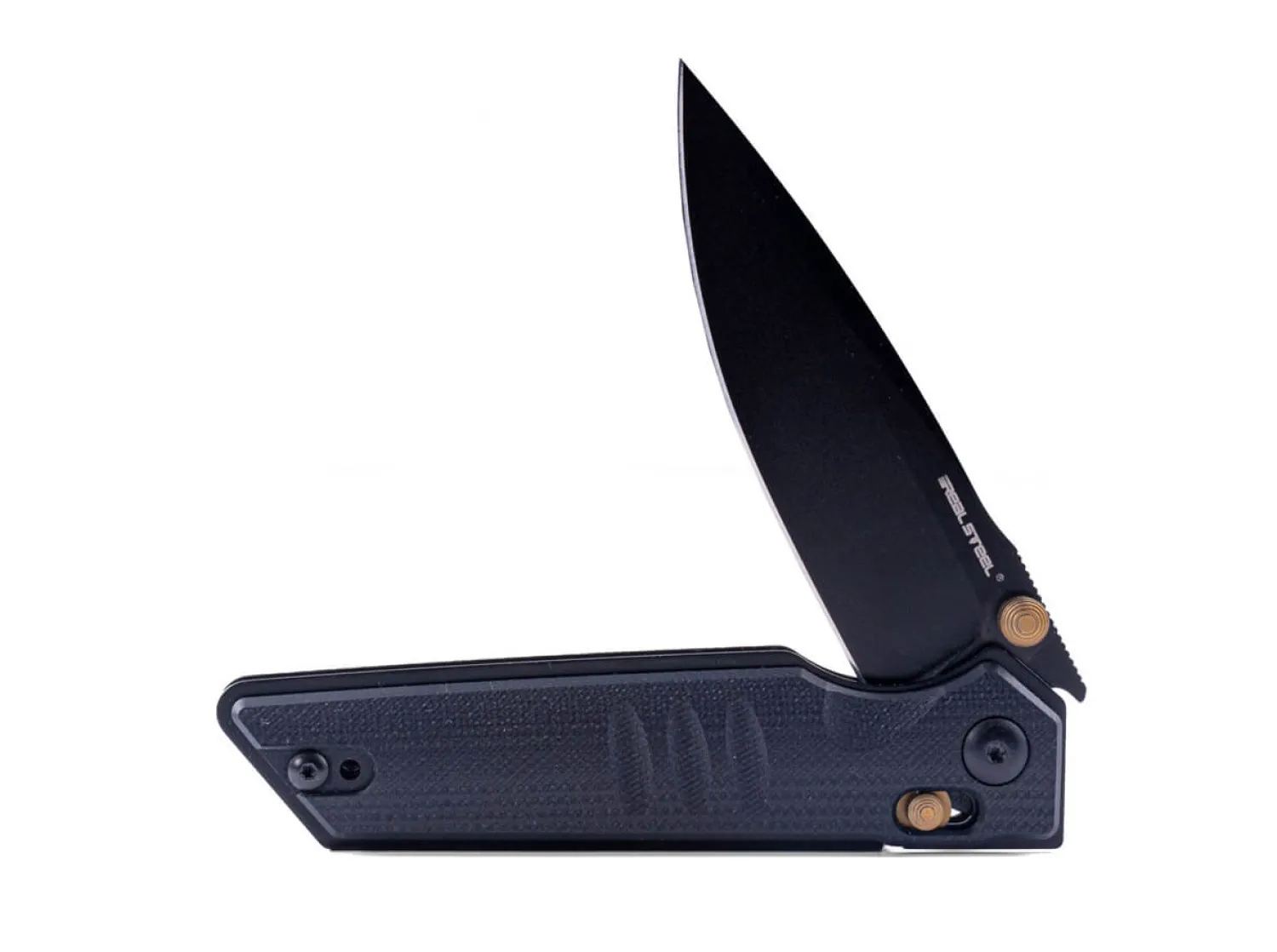 Jakub Wieczorkiewicz von Poltergeist Works bekennt sich im komplett schwarzen Sacra zu klaren Kanten und stattet das EDC-Messer mit Daumenpin zum Öffnen und praktischem Slide-Lock Mechanismus zum Entriegeln des Messers aus. Die imposante Droppoint-Klinge mit ausgeprägter Fehlschärfe ist aus hochfestem Böhler K110 gefertigt und schneidet Kartons, Seile oder Verpackungen mit Leichtigkeit. Die Griffschalen aus schwarzem G10 sind auf Edelstahl-Linern verschraubt und vermitteln höchste Stabilität. Mit umsetzbarem Tip-Up Clip.