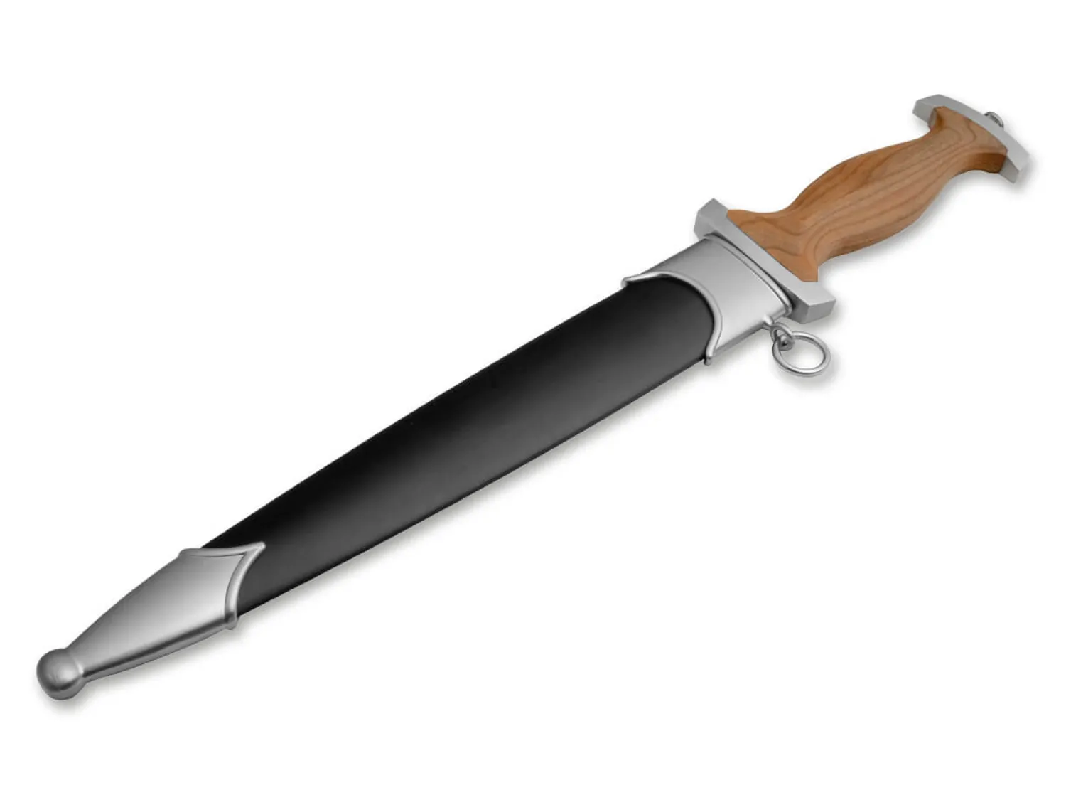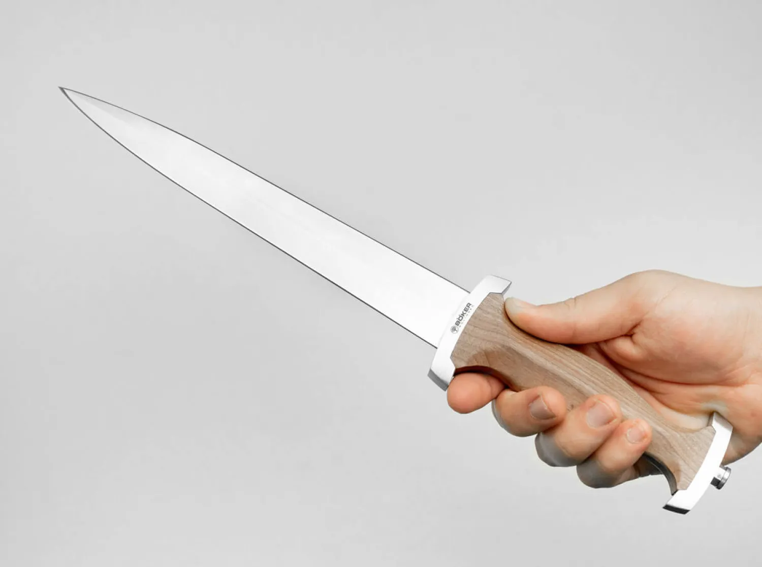 Der Schweizer Dolch war eine gängige Waffe der Schweizer Pikeniere im 15. und 16. Jahrhundert, der aufgrund seiner Klingenlänge oftmals eine Mittelstellung zwischen Dolch und Schwert einnahm. Der auch als Baselard bekannte Dolch wurde für gewöhnlich nicht als Ausrüstungsgegenstand ausgegeben, sondern musste privat von den Soldaten beschafft werden und dienten dann als Sekundärwaffe.Charakteristisch für den Schweizer Dolch ist die Gestaltung von Handschutz und Abschlussknauf. Die außergewöhnliche, gekrümmte Formgebung kann bis in das frühe 13. Jahrhundert zurückverfolgt werden und lässt sich auch in der authentischen Formgebung der von uns in Handarbeit gefertigten Neuauflage wiederfinden. Für die Griffschalen des Dolches wird handverlesenes heinisches Kirschholz verarbeitet, das sich insbesondere wegen seiner rötlichen Farbe bereits seit der Antike großer Beliebtheit erfreut.Die beidseitig geschärfte und spitz zulaufende Dolchklinge wies schon bei historischen Modellen einen Querschnitt in Form eines Diamanten auf, denn diese Konstruktion erwies sich als äußerst stabil und effektiv. Sie wird aus dem klassischen Kohlenstoffstahl C75 gefertigt und beeindruckt schon allein aufgrund ihrer Länge. Das Logo und die individuelle Seriennummer garantieren die Authentizität des Messers und stehen für eine gleichbleibend hohe Fertigungsqualität. Mit aufwendiger Metallscheide. Handgefertigt in der Böker Messer-Manufaktur Solingen.