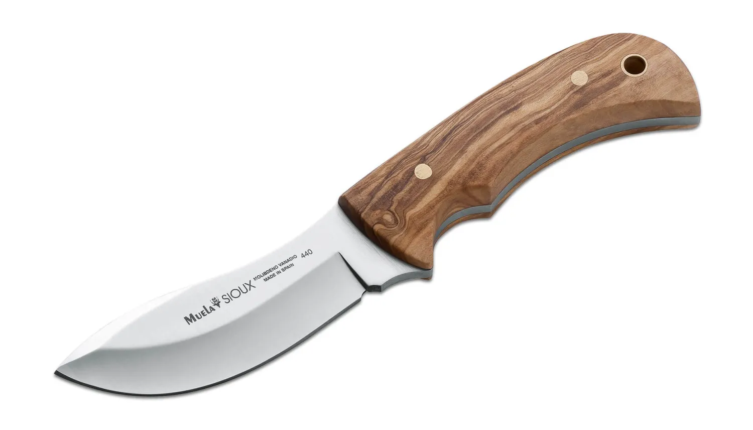 Das Muela Sioux ist ein klassischer Skinner mit Olivenholzbeschalung in Vollerlbauweise. Die Klinge wird aus 4116 gefertigt. Die hochwertige braune Lederscheide lässt sich mithilfe der Schlaufe leicht am Gürtel befestigen.