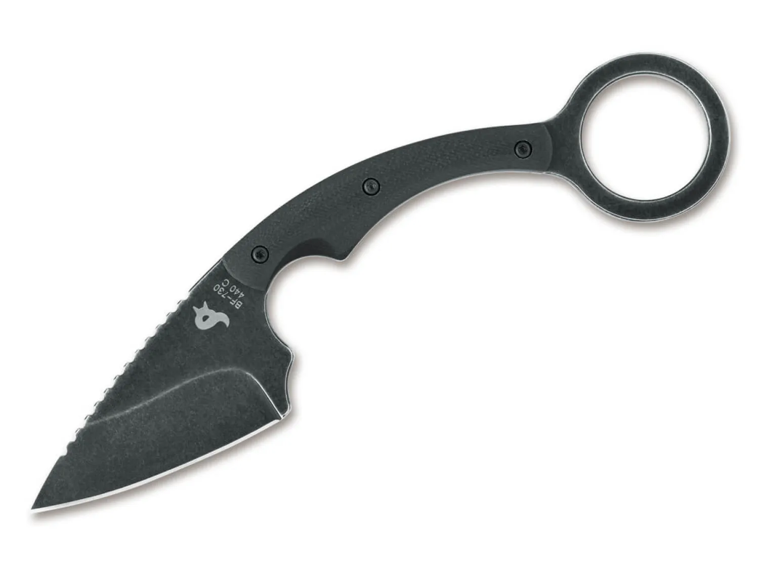 Als schlankes Neck Knife oder als kompaktes Gürtelmesser ist das BlackFox Specwarcom durch seine absolut alltagstaugliche Klingenform ein überaus nützlicher Begleiter. Und mit Sicherheit wird es auch bei der Verarbeitung von Fisch und Flugwild gute Dienste leisten. Der Einsatzbereich ist aber deutlich weiter gefasst. Wer ein griffsicheres, nicht zu großes und leichtes Fixed Blade mit origineller Optik sucht, ist mit dem Specwarcom bestens beraten. Die aufgeschraubten Griffschalen aus schwarzem G10 sorgen für mehr Volumen der schlanken Konstruktion und harmonieren wunderbar mit der rostfreien 440C-Klinge im schwarzen Acidwash-Finish. Lieferung mit Kydexscheide.