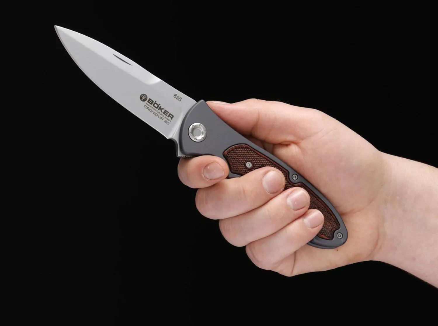 Das Böker Turbine Forty-Two ist die Zweihandversion des erfolgreichen Böker Turbine. Der Griffkörper aus Aluminium ist mit einer edlen Einlage aus zertifiziert importiertem Palisanderholz versehen. Die 4 Millimeter starke Klinge wird aus stickstofflegiertem Cronidur-30 gefertigt, der sich durch hohe Korrosionsresistenz auszeichnet. Die Arretierung übernimmt ein stabiler Linerlock. Dank der angenehm geformten Fingermulden liegt das Messer besonders sicher in der Hand. Die Klingenöffnung erfolgt per Nagelhau. Der Clip kann sowohl Tip-Up als auch Tip-Down getragen werden, die jeweils offene Clip-Aussparung wird mit einer beiliegenden Platine optisch verdeckt.