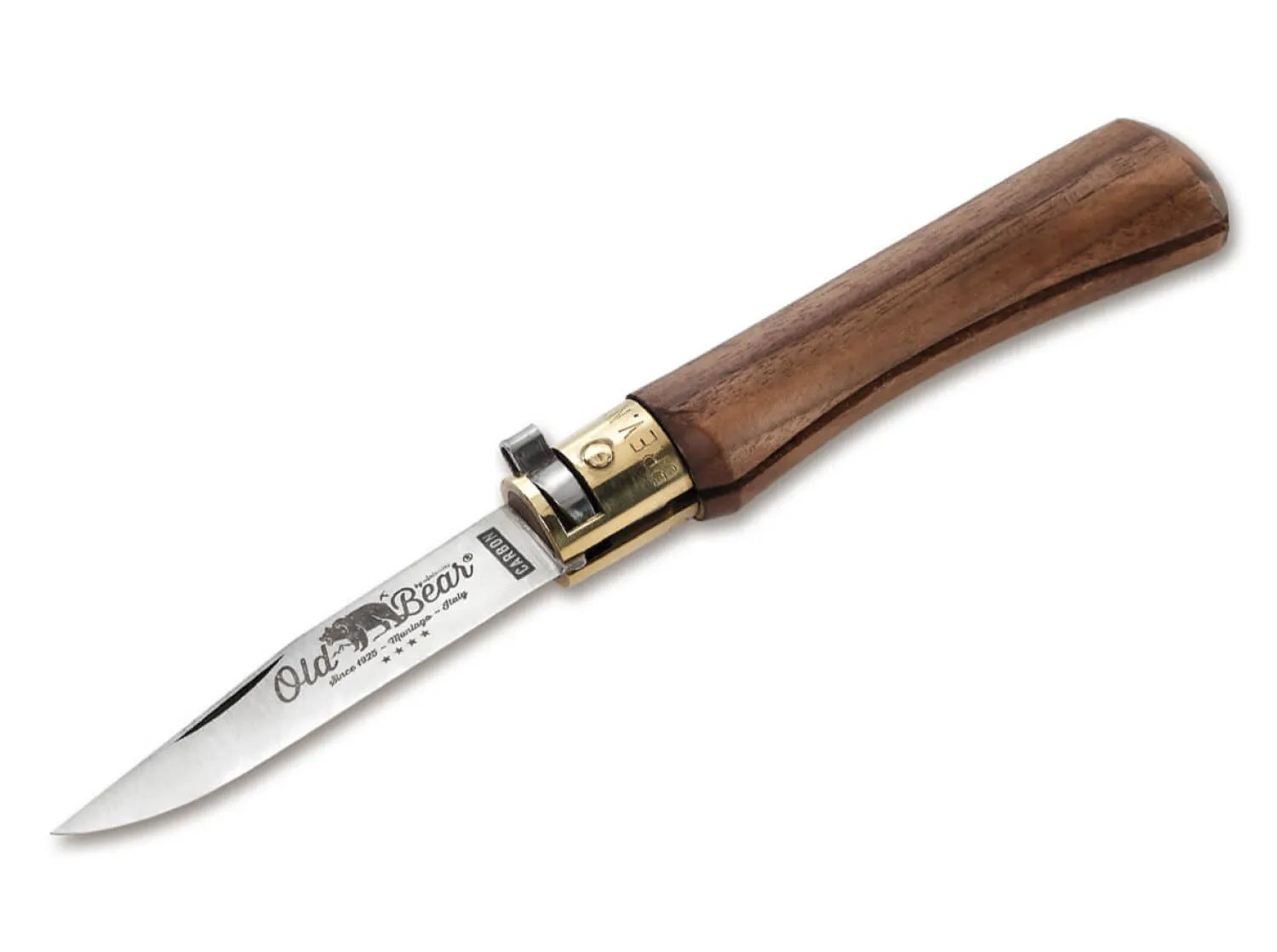 Nach dem großen Erfolg und der anhaltenden Beliebtheit der Old Bear Serie im Stil traditioneller Gebrauchstaschenmesser hat Antonini für die Liebhaber des Ursprünglichen und Authentischen dieselbe Serie auch in gutem altem Kohlenstoffstahl aufgelegt. Wenn dem Stahl kein Chrom zugefügt ist, hat er den Vorzug der sehr leichten Nachschärfbarkeit. Für diese Art von Klinge muss kein aufwändiges Schärfsystem oder gar der Hersteller bemüht werden. Wie zu Großvaters Zeiten reicht schon die Unterseite eines Tellers oder der Boden einer Kornflasche aus Steingut, um zügig wieder eine bissige Arbeitsschärfe an das Messer zu bekommen. Die Klingen erhalten im Gebrauch allmählich die zünftige graue Patina, die dann ihrerseits einen gewissen Rostschutz bietet.