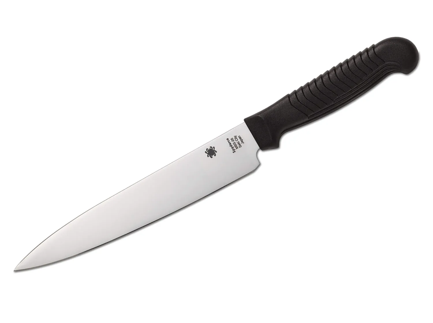 Großes Universalmesser von Spyderco. Mit ergonomisch geformten Kunststoffgriff (Polypropylen) und hochwertiger Klinge aus MBS-26 für den Einsatz in der Küche.