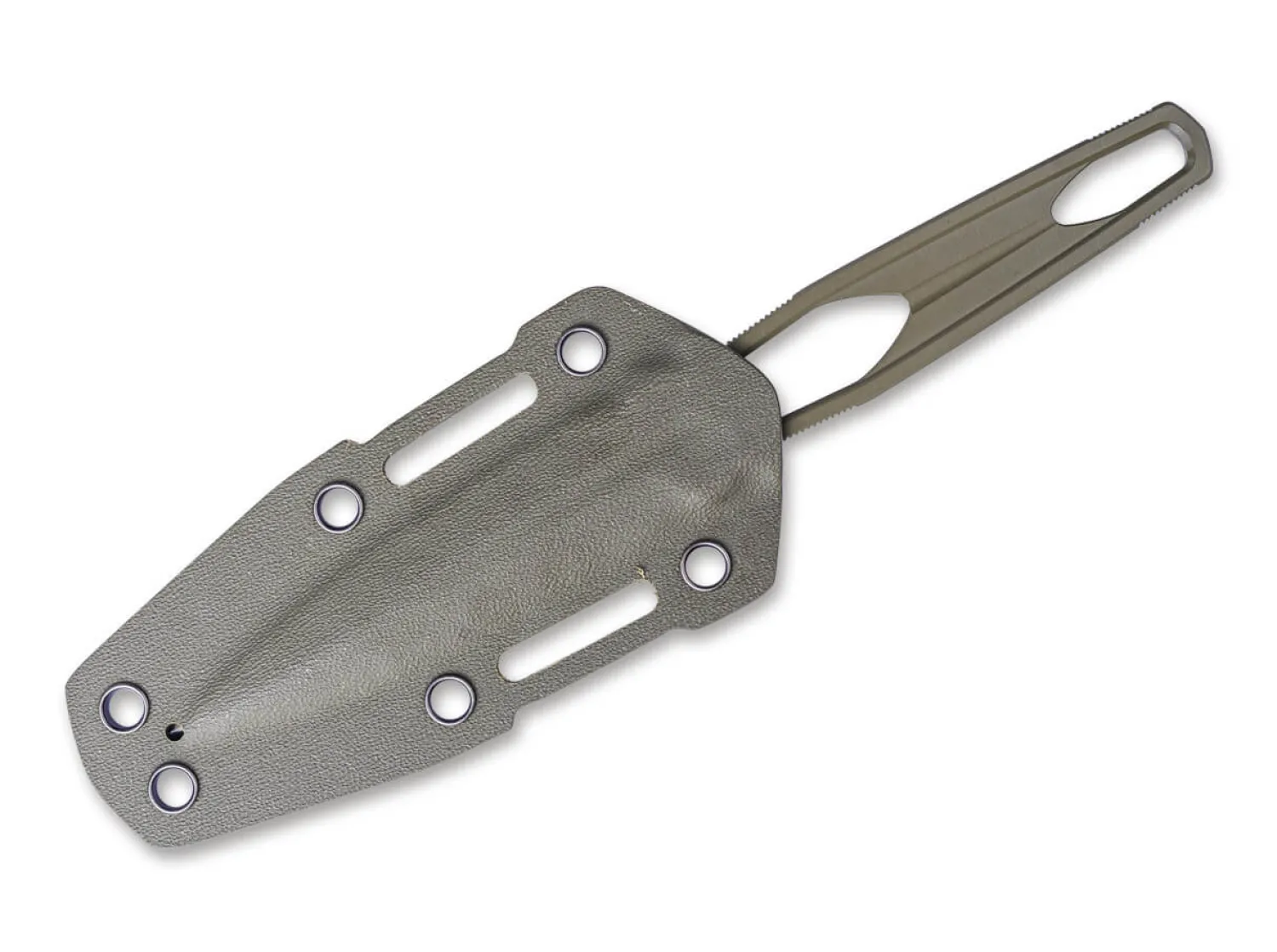 Der taktische Dolch aus der Feder von Ostap Hel ist mit einer beidseitig abgezogenen Spearpoint-Klinge aus K110 sowie einem grünen Cerakote-Finish zum Schutz vor Kratzern und zur Verminderung von Reflexionen. Geliefert wird das als Ganzstahlkonstruktion konzipierte Skelettmesser in einer passgenauen Kydexscheide.