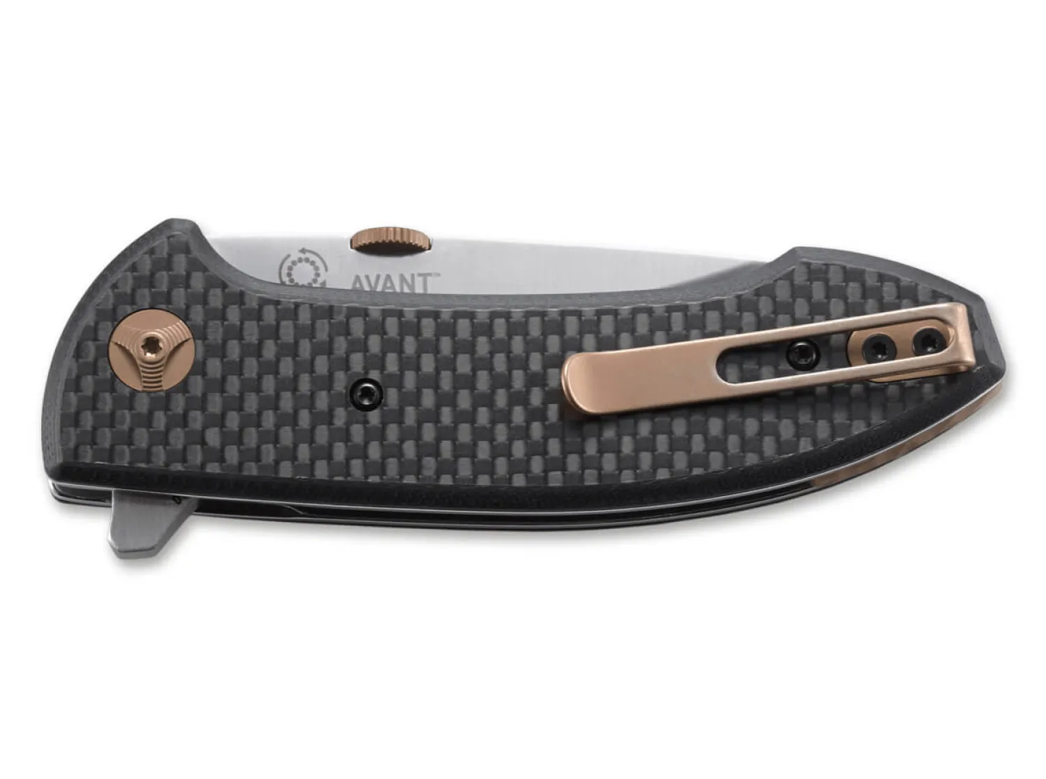 Das CRKT Avant von Eric Ochs aus Oregon ist wieder einmal ein Paradebeispiel dafür, wie gut ein minimalistisches Design ohne Schnörkel oder Schnickschnack funktioniert. Der sanft gerundete Griff des Taschenmessers liegt ausgezeichnet in der Hand, und die Öffnung der kugelgelagerten Klinge per Flipper oder Daumenscheibe ist ebenso praxisgerecht wie der umsetzbare Clip. Bronzefarbene Akzente setzen Clip, Klingenlager und die Daumenscheibe und erzeugen gemeinsam mit der Beschalung aus Kohlefaser ein edles Erscheinungsbild, das dennoch eher von Understatement zeugt. Gesichert wird die Klinge durch einen Linerlock. Mit umsetzbarem Clip (Tip-up/l-r).