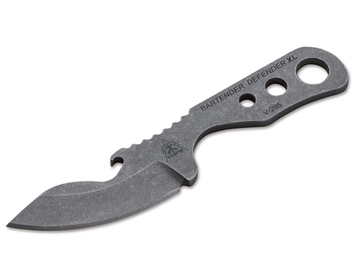 Das Bartender Defender XL von TOPS ist die konsequente Weiterentwicklung seines kleineren Bruders. Die Klinge wurde vergrößert, und der Kapselheber ist auch nutzbar, wenn das Messer noch in der mitgelieferten Kydexscheide steckt. Die 1095er Kohlenstoffstahlklinge ist mit einem ansprechenden Stonewash-Finish versehen und zum Korrosionsschutz mit einer transparenten Cerakote-Beschichtung ausgestattet. Mit praktischer Kugelkette zum Tragen als Neck Knife.
