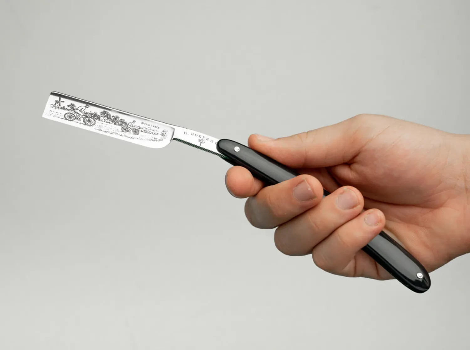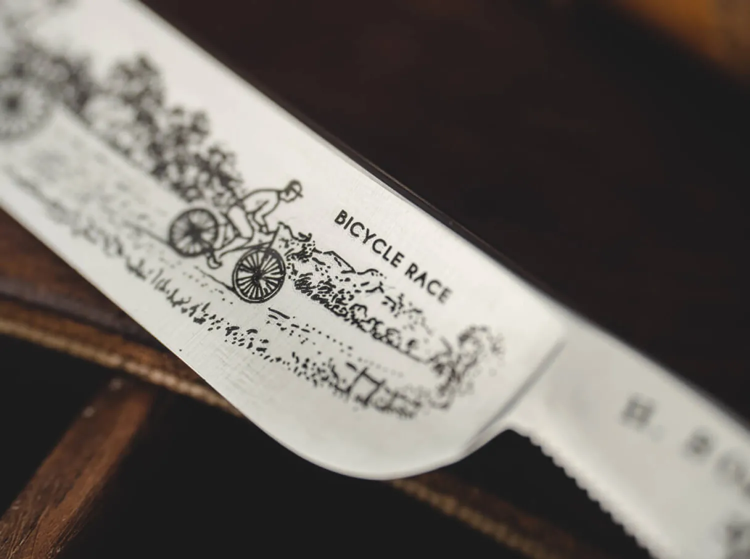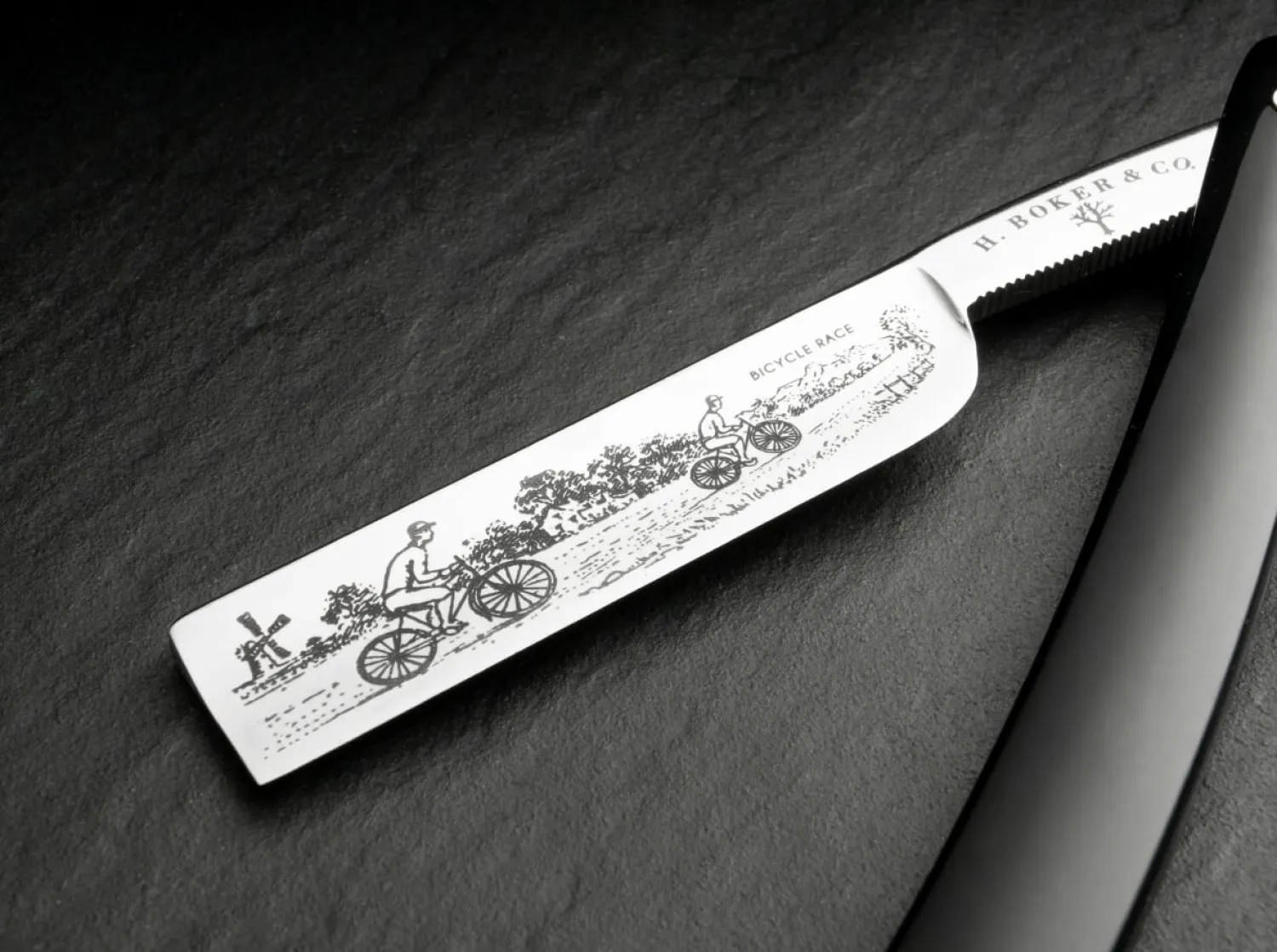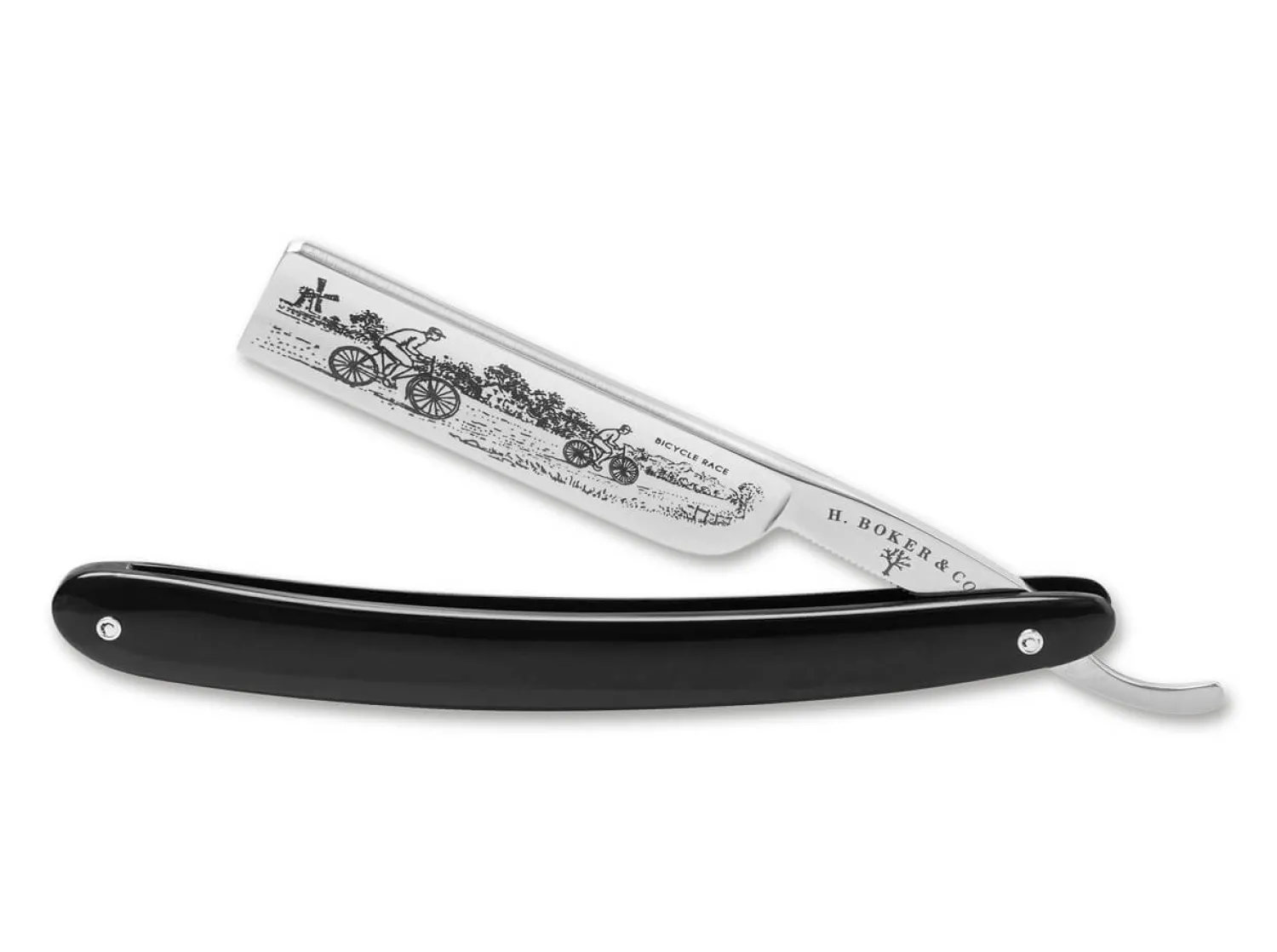 Noch bevor sich die Tour de France als bedeutendstes Radrennen der Welt etablieren konnte, quälten sich die einstigen Helden auf zwei Rädern über grobes Kopfsteinpflaster, staubige Schotterpisten und teils kurze und giftige Anstiege. Stahlrahmen, Baumwolltrikot, Casquette, nur ein Gang aber dafür ein heldenhafter Schnurrbart waren die übliche Ausstattung, mit der es auf die unbarmherzigen 250 km der klassischen Eintagesrennen ging. Aus diesem nostalgischen Zauber heraus entstanden die fünf Monumente des Radsports, die bis heute zahlreiche Radsportanhänger begeistern. Die ersten dieser traditionsreichen Eintagesklassiker fanden Ihren Ursprung in Belgien und Frankreich bereits vor 1900 und brachten den Siegern Ruhm und Ehre ein.Böker holt ein Stück Geschichte zurück und präsentiert das Böker Bicycle Race als Neuauflage des um 1900 erschienenen gleichnamigen Rasiermessers. Die Klinge des weltweit auf 300 Exemplare limitierten Sondermodells zeigt nach historischem Vorbild ein klassisches Radrennen in malerischer Landschaft. Dabei füllt das aufwendig restaurierte und in mehreren Schichten gelaserte Motiv fast die komplette Klinge aus, während das historische H. Boker & Co Logo den Klingengang ziert.Die 5/8 Zoll breite Klinge aus widerstandsfähigem Kohlenstoffstahl ist mit einem Gradkopf versehen und steht für die Vielseitigkeit, Robustheit und Geradlinigkeit jener klassischen Fahrräder, die mit einer festgelegten Ausstattung für alle Terrains gewappnet sein mussten – das Böker Bicycle Race steht dem in puncto Rasur also in nichts nach. Das edle Satin Finish und die einseitige Serrierung runden das heldenhafte Profil des Rasiermessers ab. Der ballige Griff aus schwarzem Kunststoff würde zeitgenössisch mit zwei Nieten aus Neusilber veredelt. Lieferung mit Echtheitszertifikat und historischer Verpackung. Handgefertigt in der Böker Messer-Manufaktur Solingen.
