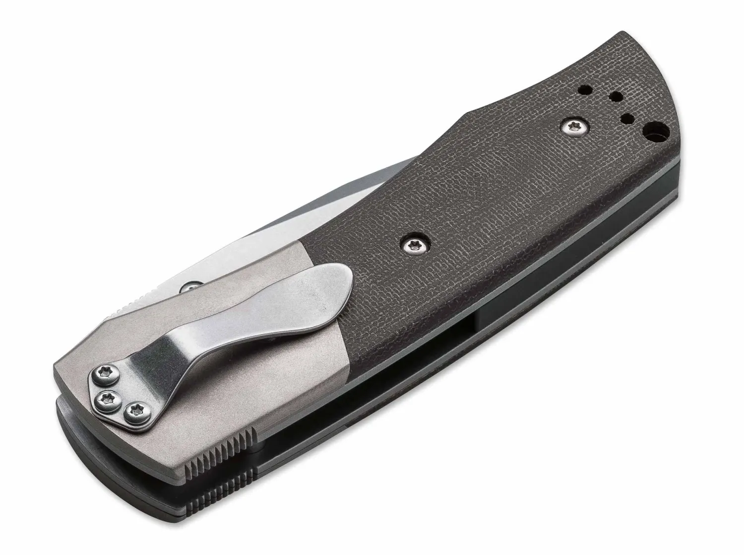 Kompakter als das Squail, aber dennoch in der gleichen Handschrift gezeichnet ist das Bullpup von Charles Marlowe. Die hohlgeschliffene Clippoint-Klinge, die auch beim Bullpup aus VG-10 gefertigt wird, ist gedrungen, aber dennoch elegant, und die Linienführung des ganzen Messers verrät die kundige Hand von Charles Marlowe. Auch das Bullpup ist mit einem Linerlock mit Edelstahlplatinen sowie Titanbacken ausgestattet, und der kurze Clip ist umsetzbar (Tipup/ Tip-down). Die Beschalung aus gestrahltem Leinenmicarta trägt ihren Teil zur Griffigkeit ebenso bei wie die Daumenriffelung auf Griff und Klinge. Kompakt, kräftig, effektiv und führig – Bullpup!
