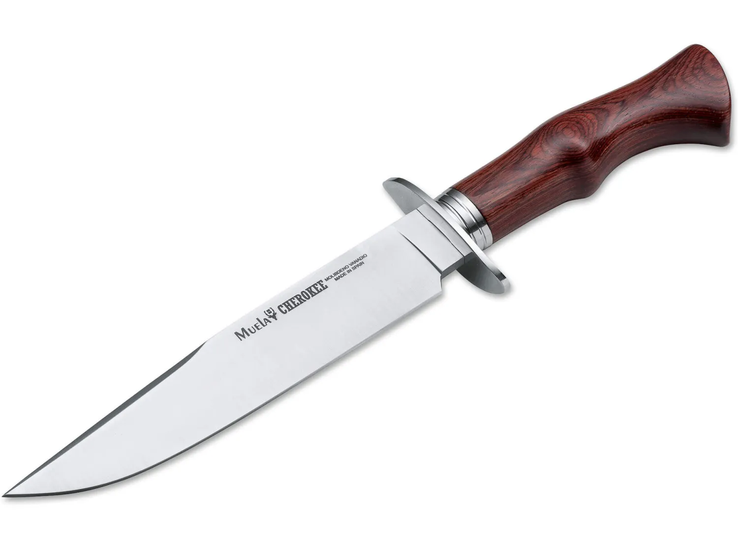 Der größere Bruder des Muela Cazorla besitzt einen ebenso angenehm gerundeten Griff aus Pakkaholz, der jedoch hier noch von einer Edelstahlzwinge unterhalb des Parierelementes eingefasst wird. Die Klinge aus 4116 ist flachgeschliffen und besitzt eine weniger stark ausgeprägte Bowieform mit angedeuteter Fehlschärfe. Lieferung mit Lederscheide mit zusätzlichen Zierriemen aus Leder.