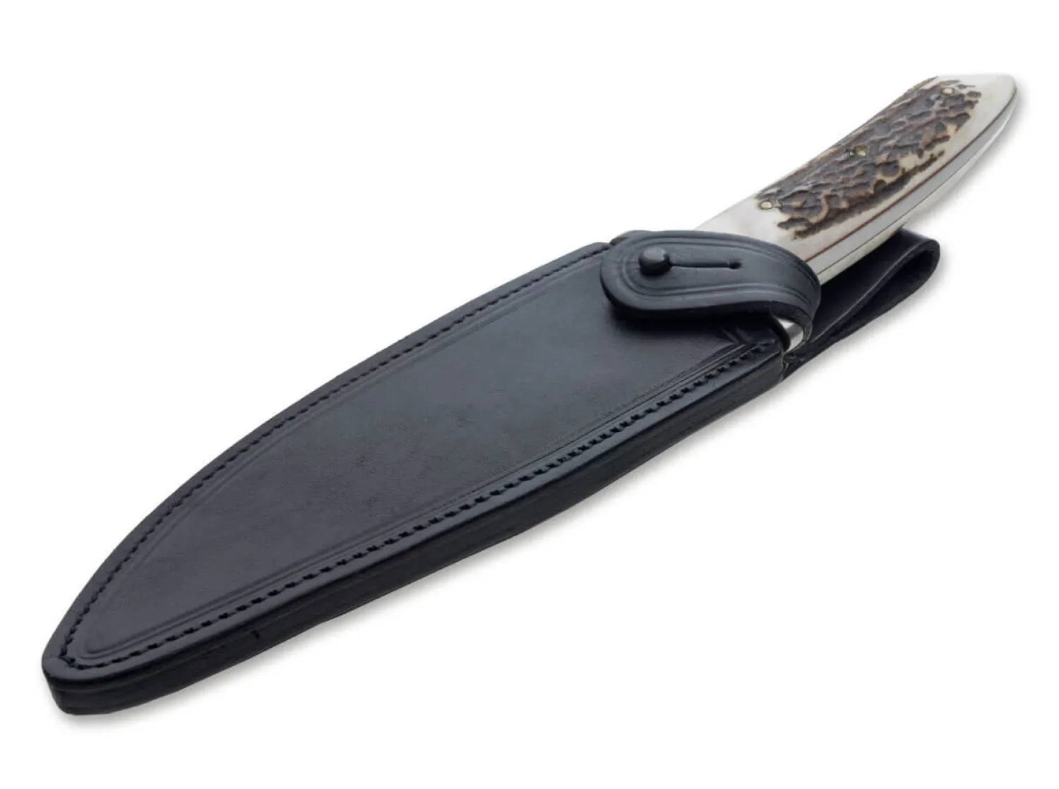Die massive Bauweise in Kombination mit der klassischen Optik und dem hohen Gebrauchswert machen das Böker Arbolito Esculta, die kompaktere Version des El Gigante, zu einem ausgezeichneten Begleiter für Outdoor und Jagd. Die traditionellen Griffschalen werden aus handverlesenem Hirschhorn gefertigt. Die klassischeAnmutung des Materials im Zusammenspiel mit dem überaus praxistauglichen Stonewash-Finish machen das Bowie zu einem außergewöhnlichen Messer nicht nur für den Einsatz, sondern auch für den Sammler. Die massive Klinge aus Böhler N695-Stahl läuft komplett durch den Griff und verjüngt sich zum Griffabschluss. Der sogenannte Tapered Tang verleiht dem Messer eine besondere optische Note und balanciert es optimal aus. Der ausladende und kräftige Handschutz aus gebürstetem Edelstahl verspricht hohe Arbeitssicherheit und trägt zum edlen Erscheinungsbild bei. Lieferung mit hochwertiger Lederscheide.
