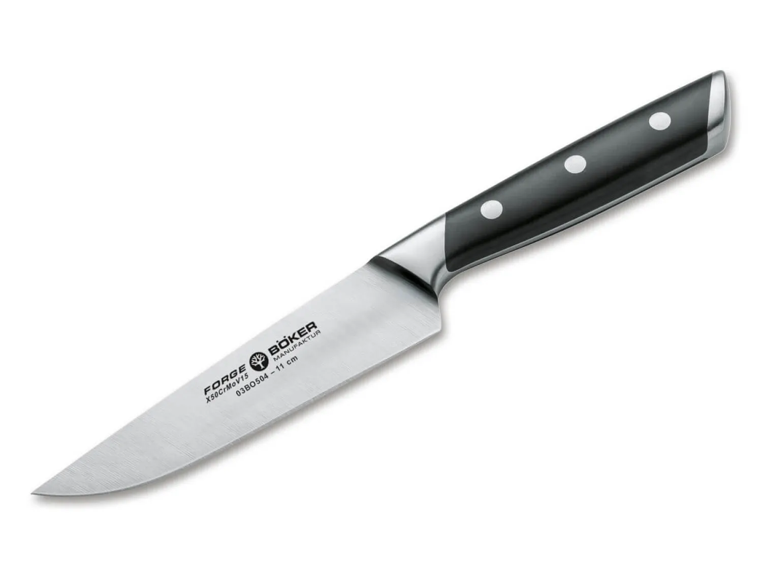 Die Kochmesser-Serie Böker Forge verbindet innovative und dynamische Formgebung mit klassischer Materialauswahl in Premiumqualität. Auffallend ist die attraktive Linienführung, die die Messer deutlich von der Masse der herkömmlichen Küchenmesser abhebt, ohne zu exzentrisch zu wirken. Darüber hinaus überzeugt die Serie Böker Forge mit einem ausgesprochen attraktiven Preis-Leistungs-Verhältnis. Die aus dem Chrom-Molybdän-Vanadium Edelstahl X50CrMoV15 gefertigten Messer sind optimal ausbalanciert und liegen durch die ergonomische Griffgestaltung perfekt in der Hand. Schwarze Griffschalen aus hochwertigem Spezialkunststoff werden klassisch mit drei Edelstahlnieten dauerhaft und ohne Fugen mit dem vollständig durchgehendem Messererl verbunden. Die Gestaltung der Klingen samt Übergang zum Kropf erlaubt ein problemloses Nachschärfen und gewährleistet in Kombination mit der richtigen Pflege eine langfristig perfekte Funktion der Messer. Bitte reinigen Sie die Messer nur per Handwäsche und nicht in der Spülmaschine. Darüber hinaus überzeugt die Serie Böker Forge mit einem ausgesprochen attraktiven Preis-Leistungs-Verhältnis. Die Auslieferung der Messer erfolgt in einer hochwertigen Geschenkverpackung.Das Universalmesser, oder auch Allzweckmesser, ist eine sehr handliche Mischung aus Kochmesser und Schälmesser. Häufigster Einsatzbereich des Allzweckmessers in der Küche ist das Verarbeiten von Obst und Gemüse, das damit sowohl geschält als auch geschnitten werden kann. Aber auch kleinere Fisch- und Fleischstücke lassen sich damit bequem schneiden. Da das beidseitig geschliffene Messer sehr häufig gebraucht wird, sollte es in keiner Küche fehlen.