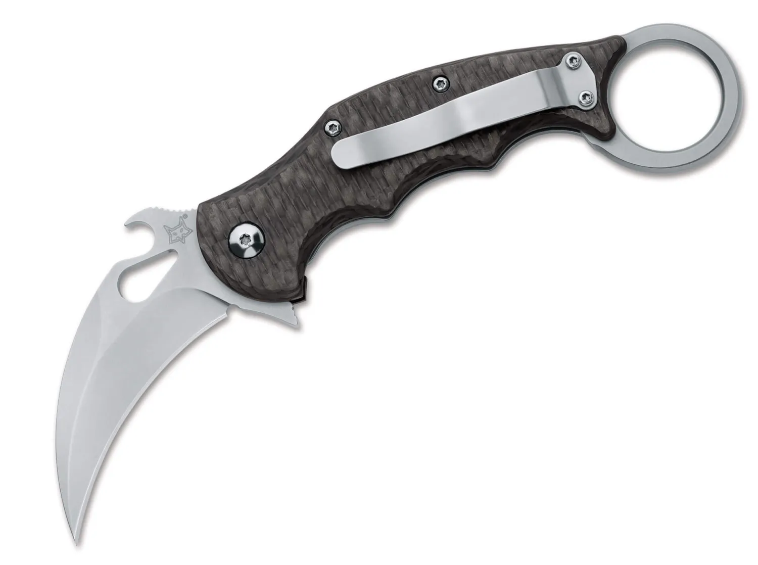Die Edelversion des überaus beliebten Fox Karambit ist mit seiner Bauweise als Titan-Framelock auf maximale Stabilität ausgelegt, wobei die geniale Hybridbauweise aus Kohlefaser und Titan der rückwärtigen Schale und die komplett aus Kohlefaser gefertigte Vorderschale dennoch für einen echten Leichtbau sorgt. So ist das Karambit Titan nicht nur technisch ein echter Leckerbissen, sondern auch optisch eine absolute Augenweide für alle Fans des modernen Klappmesserbaus. Als Klingenstahl kommt hier N690 zum Einsatz und sorgt für die Schnitthaltigkeit. Umsetzbarer Clip. Mit unbeschichteten Stahl- und Titanteilen.