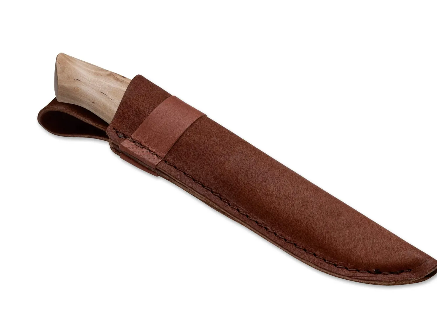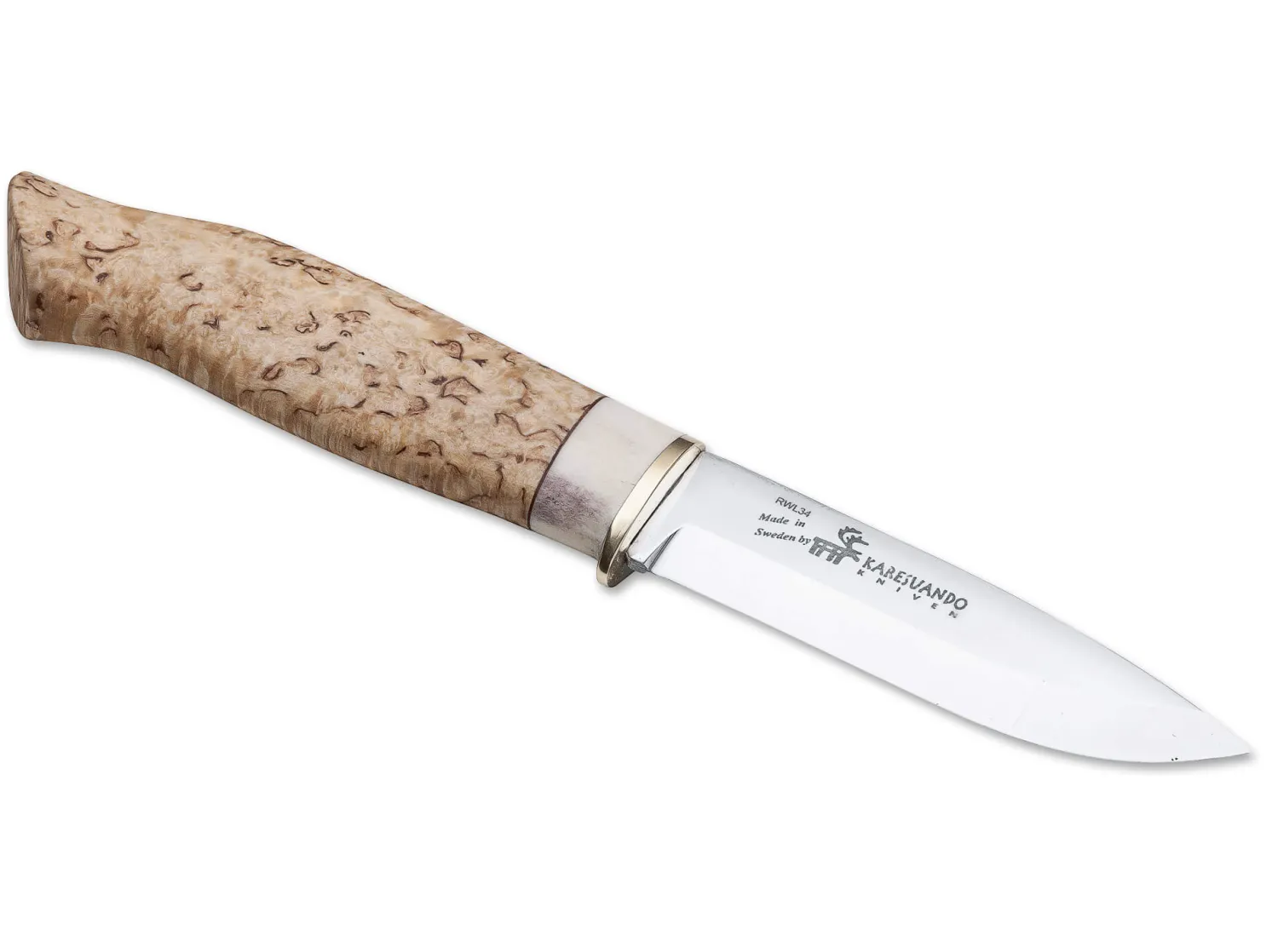 Mit seiner pulvermetallurgischen Klinge aus RWL34 ist das Galten hinsichtlich Schnitthaltigkeit und Stahlqualität ganz oben einzuordnen. Der Griff mit kleinem Fingerschutz aus Messing besteht aus geölter Maserbirke und Rentierhorn. Lederscheide mit Gürtelschlaufe und Kunststoffeinsatz.