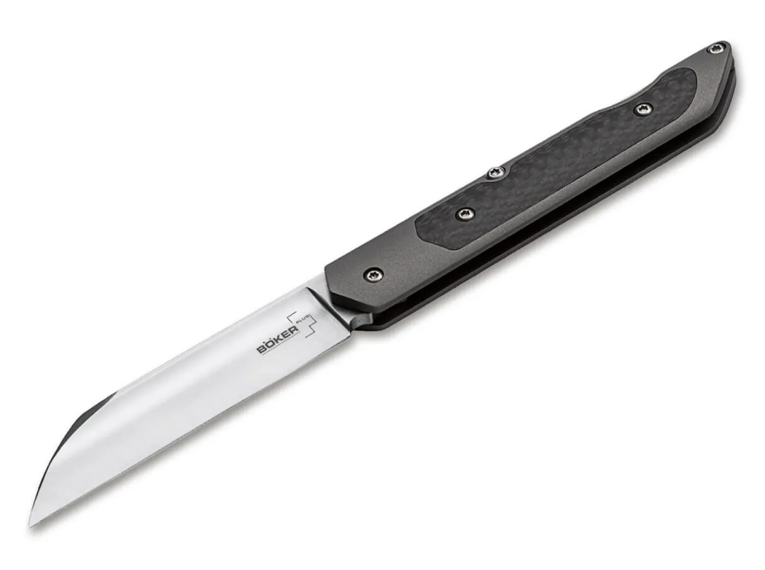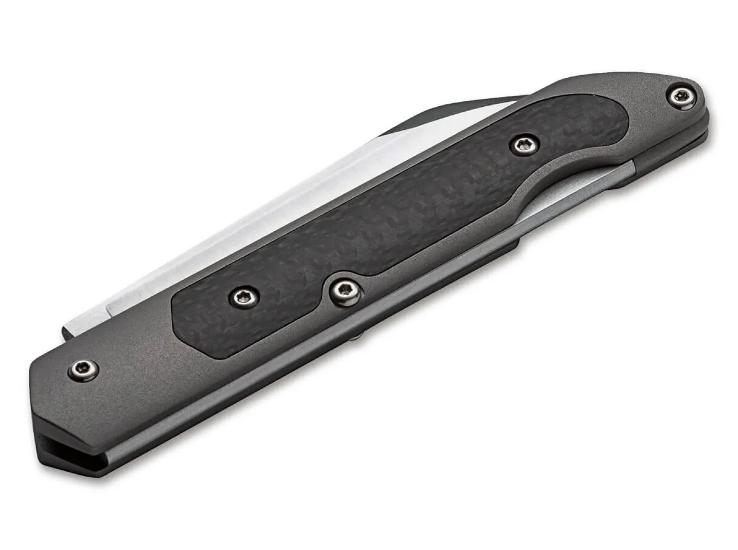Das extrem schlanke Böker Plus Genios ist ein modernes Gentlemanmesser mit symmetrischer Linienführung. Die schmale Sheepfoot-Klinge aus VG-10 verfügt über einen balligen Klingenrücken und wird durch einen neuartigen, patentierten Backlock verriegelt, der auf einem platzsparenden Drahtbügel basiert. So wird keine zusätzliche Oberfeder mehr benötigt und der Klinge steht deutlich mehr Platz im Griff zur Verfügung. Der konturierte Griff aus Titan ist mit Einlagen aus Kohlefaser versehen und verzichtet auf einen Clip, wodurch das Gewicht des Taschenmessers weiter reduziert wird. Stattdessen wird das Genios mit einem schwarzen Stecketui aus Leder ausgeliefert. Mit hochwertigem Nylon-Etui zur Aufbewahrung.