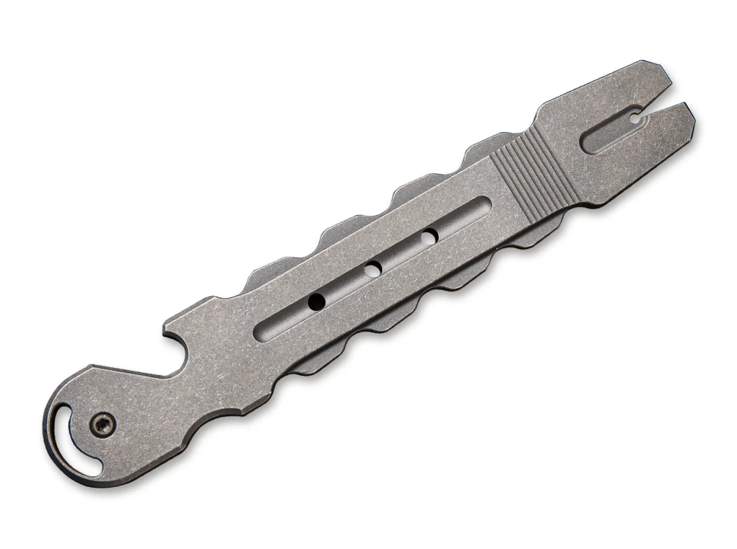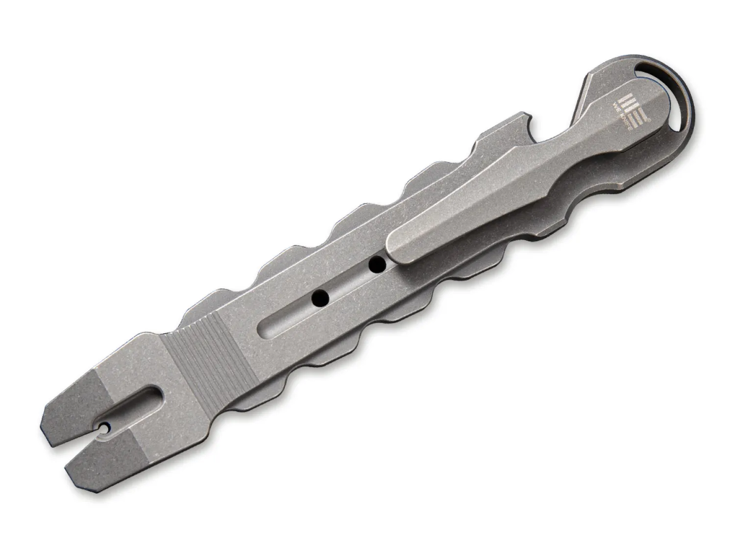 Das kompakte Multifunktionswerkzeug Gesila von WE Knife ist mit hilfreichen Werkzeugen ausstattet, die ein breites Einsatzspektrum ermöglichen. Das aus Titan gefertigte Werkzeug ist mit einem grauen Stonewash-Finish versehen. Dank Fangriemenöse und Clip (Tip-down) kann es flexibel angebracht und getragen werden.