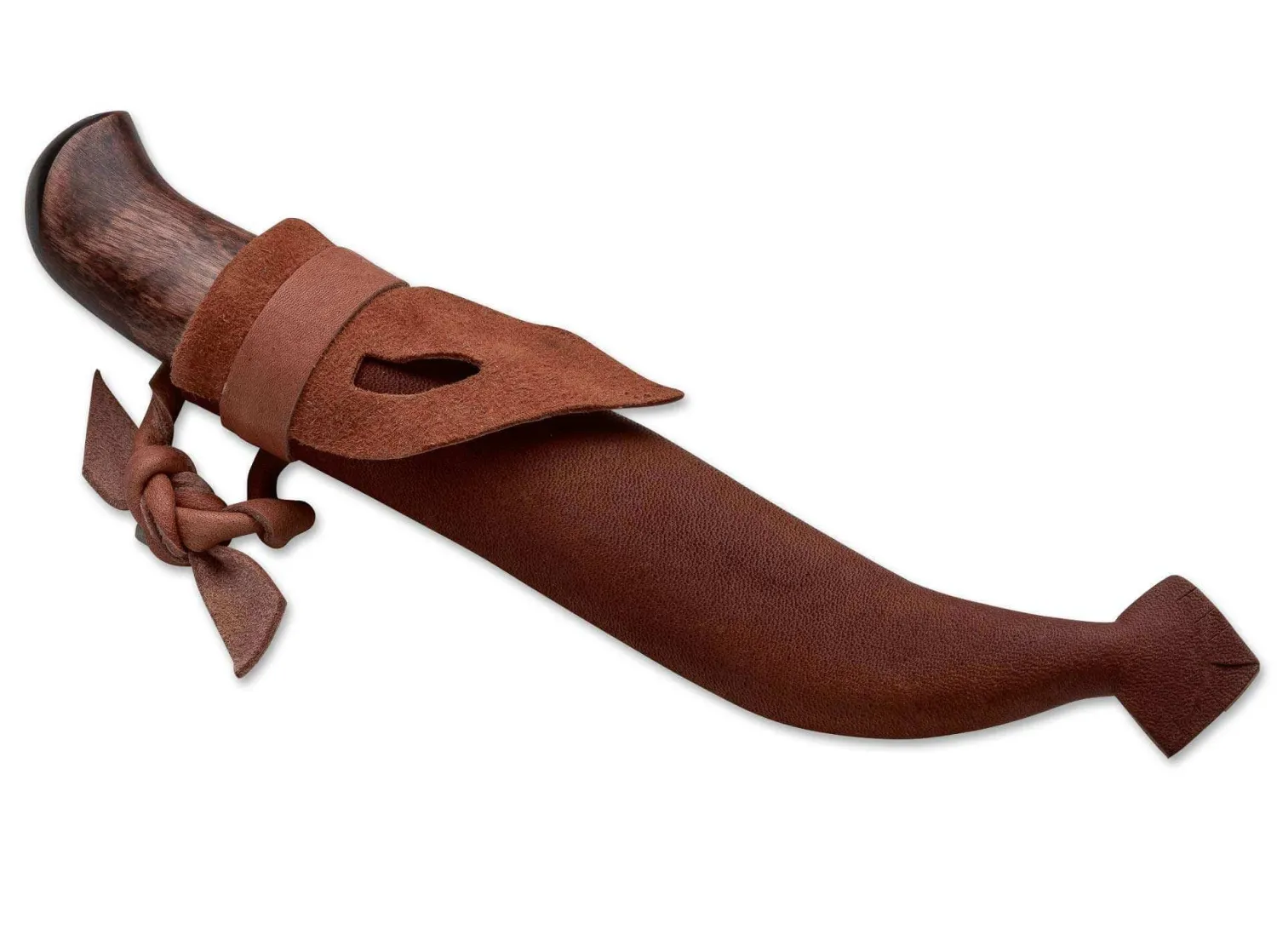 Das in traditioneller Form gebaute Giron ist das kompakteste Messer dieser Auswahl, ein sehr klassisches Finnenmesser in den traditionellen Proportionen, die auch bei einem kompakten Messer einen vollwertigen Griff gewährleisten. Der Griff mit Messingabschluss wird aus geölter Maserbirke und Rentierhorn gefertigt und liegt dank des breiten Abschlusses sehr sicher in der Hand. Traditionelle Lederscheide nach samischer Art mit Lederriemen (ohne Gürtelschlaufe) und Kunststoffeinsatz. Klingenstahl 12C27.