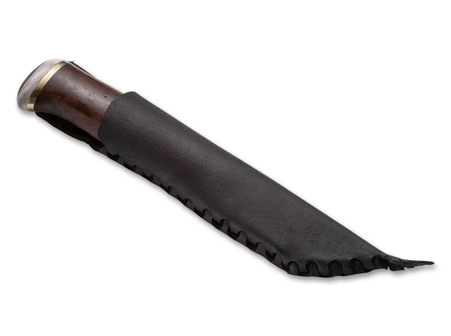 Im Lappländischen Dialekt „Meijän Kieli“ bedeutet „Hieno“ schlicht: wunderschön! Auf den ersten Blick sieht man, dass dieses Messer seinem Namen alle Ehre macht und Karesuando hiermit eine ganz neue Stufe von Verarbeitung und Finish erreicht. Der handschmeichelnde Griff aus Holz, Messing, Rentier-Horn und dem ebenfalls aus Messing gefertigten Emblem im Knauf ist fugenlos zusammengesetzt und perfekt poliert. Die Klinge mit traditionellem Scandi-Schliff aus dem bewährten Sandvik 12C27 hat die optimale Länge für alle Outdoor- und Bushcraft-Arbeiten. Ein besonderer Clou ist die schlanke und passgenaue Scheide, die ohne Keder, Naht oder zusätzliche Lederschnur aus einem Stück Leder geschnitten und genial geflochten ist. Mit Griff aus geflämmter Maserbirke, dem traditionellen Holz des hohen Nordens.