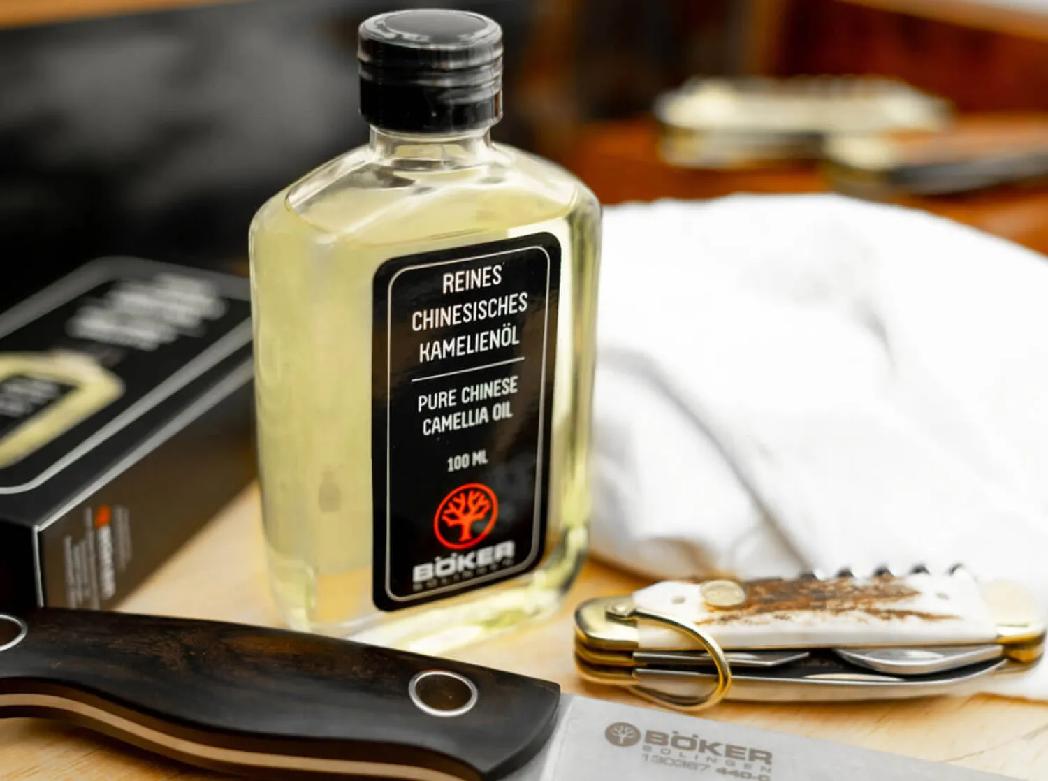 Das hochwertige, reine Böker Kamelienöl wird nach traditioneller chinesischer Rezeptur produziert und ist vielseitig anwendbar. Das dünnflüssige Öl wird aus dem Samen des Kamelienbaums gewonnen, ist geschmacksneutral, geruchlos und trocknet nicht. Das Kamelienöl ist lebensmittelecht und überzeugt durch seine besondere Reinheit. Korrosionsschutz: Das säurefreie, nicht verharzende und nicht flüchtige Kamelienöl wird traditionell als Korrosionsschutzmittel zur Pflege von hochwertigen Messerklingen aus Kohlenstoffstahl sowie Werkzeugen und Blankwaffen verwendet.Es ist rein pflanzlich und eignet sich hervorragend für das Konservieren von nicht rostfreien Koch- und Rasiermessern, da es – im Gegensatz zu anderen Pflegeölen – keine Emulsion mit Wasser eingeht. Holzschutz: Das niedrigviskose Öl zieht rasch ins Holz ein und schützt vor Nässe, Verschmutzung und UV-Strahlung. Das Kamelienöl ist klar, verfärbt das Holz nicht und bringt die Holzmaserung wunderschön zur Geltung. Hervorragend geeignet zur Pflege von hochwertigen Rasiermesserheften und (Koch-) Messergriffen aus Edelhölzern.