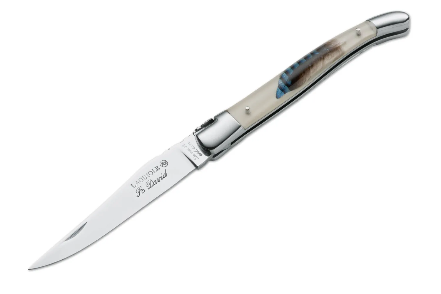 Die weiße Kunstharzbeschalung zeigt auf jeder Seite eine echte Eichelhäherfeder mit dem charakteristischen blauen Schimmer, sicher auf immer und ewig unter Acryl eingefangen. Polierte Klinge und polierte Edelstahlbacken. Filework an der Rückenfeder.