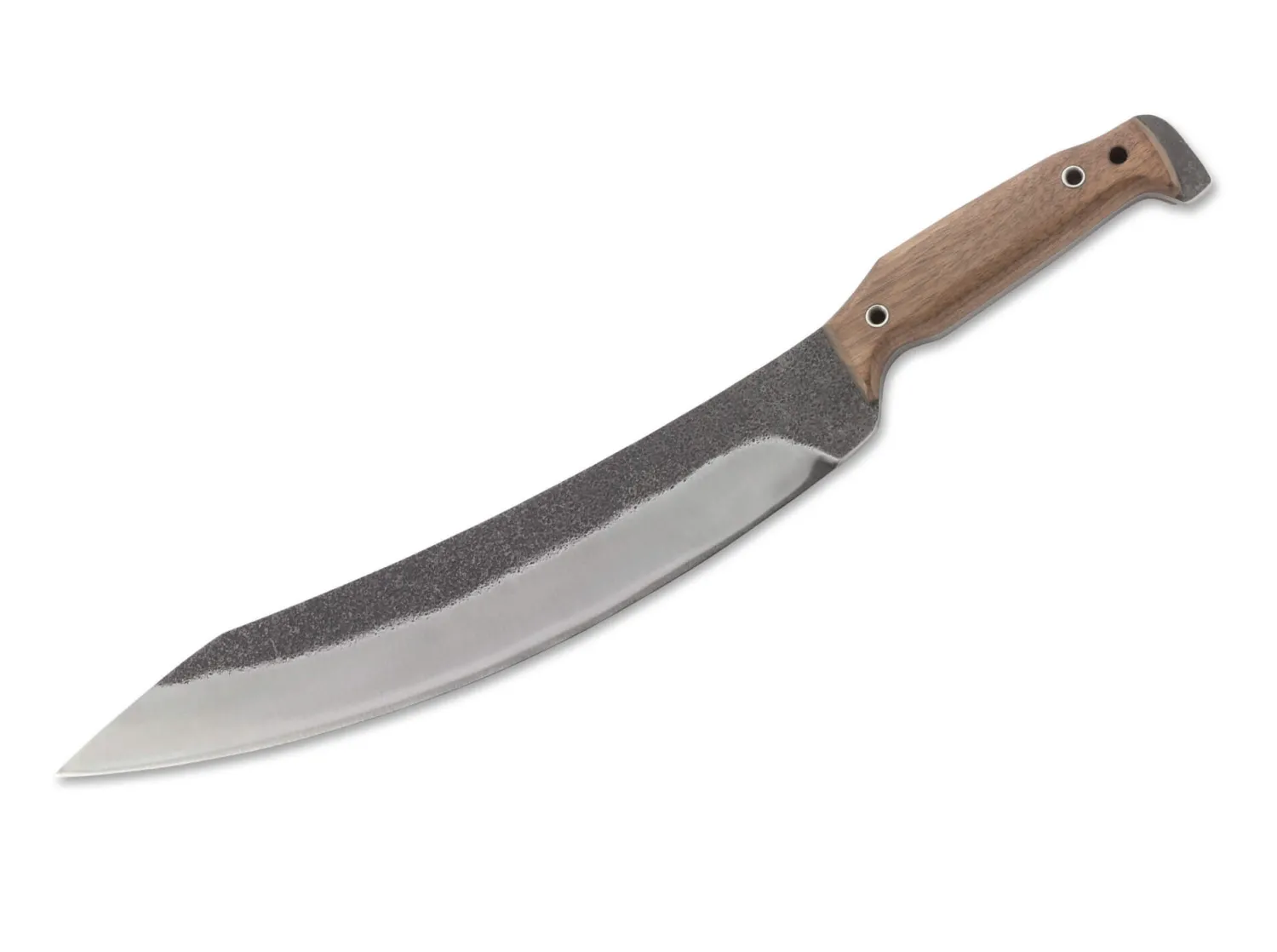 Für diesen Entwurf zeichnet der Designer Liong Mah verantwortlich, dessen Designs für ihre Funktionalität und Praxistauglichkeit bekannt sind. Die Mahchete besitzt einen nach oben abgesetzten Griff für maximale Wucht beim Hacken, wobei der mit Walnussholz beschalte Griff mit seinem nach unten gezogenen Ende extrem sicher in der Hand liegt. Durch die Vollerl-Bauweise besitzt die Mah-chete eine überlegene Stabilität, und die Klinge aus 1075-Kohlenstoffstahl trägt mit ihrer Stärke von 4,6 mm ihren Teil dazu bei. Das urige Klingenfinish ist am Spiegel gehämmert und am Anschliff satiniert. Diese Kombination verleiht der Mah-chete einen fast schon archaischen Charakter. Lieferung mit verstärkter Nylonscheide mit Kunststoffeinsatz.