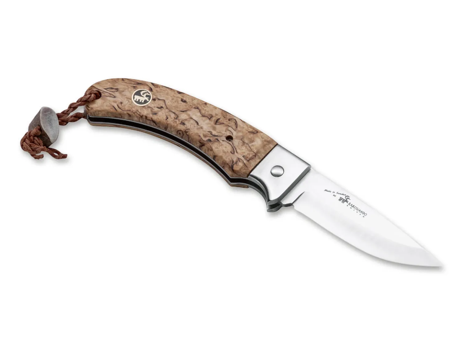 Ein erstklassiges Taschenmesser wie das Nallo von Karesuando begleitet einen ein Leben lang. Die Klinge wird aus Sandvik 12C27 gefertigt und auf 58 HRC gehärtet. Es besitzt eine leicht zu bedienende Verriegelung, die zwar auf dem Linerlock basiert, jedoch über den Knopf in der Griffschale sehr leicht und komfortabel zu bedienen ist. Die Beschalung besteht aus dem Holz der nordischen Maserbirke, die vor allem so weit jenseits des Polarkreises sehr langsam wächst und hinsichtlich Dichte und Stabilität das mitteleuropäische Birkenholz weit übertrifft. Ein besonderes Merkmal ist der Anhänger aus Lederband und Rentierhorn.