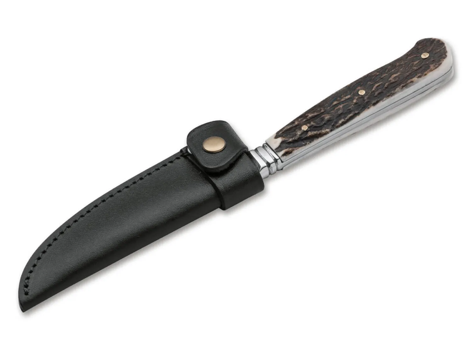 Klassischer Jagdnicker mit 10 Zentimetern Klingenlänge. Der Klingenanschliff ist satiniert, während das Parierstück und der Klingenrücken hochglanzpoliert sind. Griffbeschalung aus ausgesuchtem Hirschhorn. Lieferung mit klassischer Nickerscheide aus Leder, ohne Gürtelschlaufe. Als Klingenstahl kommt 4034 zum Einsatz.