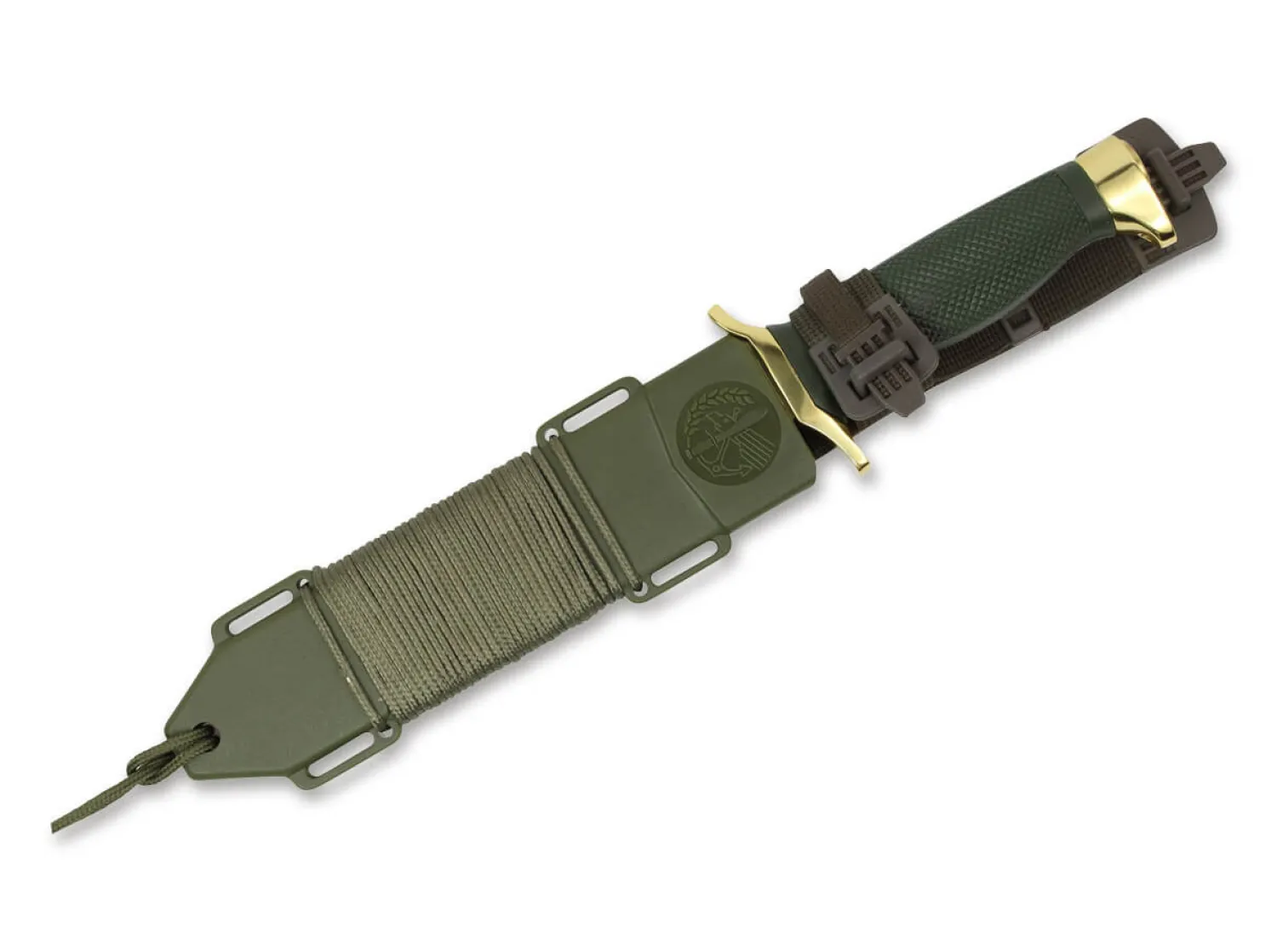 Das legendäre White Bear Messer (span. oso blanco) aus der Bear Reihe wurde für die Spezialeinheiten der spanischen Armee entwickelt und gilt unter vielen Experten als das vielseitigste Messer im Hinblick auf Ausstattung, Balance, Handhabung und Schärfe. Mit einer Härte von 55-58 HRC ist die robuste Klinge aus MoVa jeder Aufgabe gewachsen. Flachschliff und ein markanter Sägerücken sorgen für die nötige Flexibilität, während der leichte Griff aus Polyamid mit den Messingelementen an Knauf und Handschutz das optische Erscheinungsbild des Outdoor-Messers harmonisch abrunden. Lieferung mit passgenauer Kunststoffscheide.