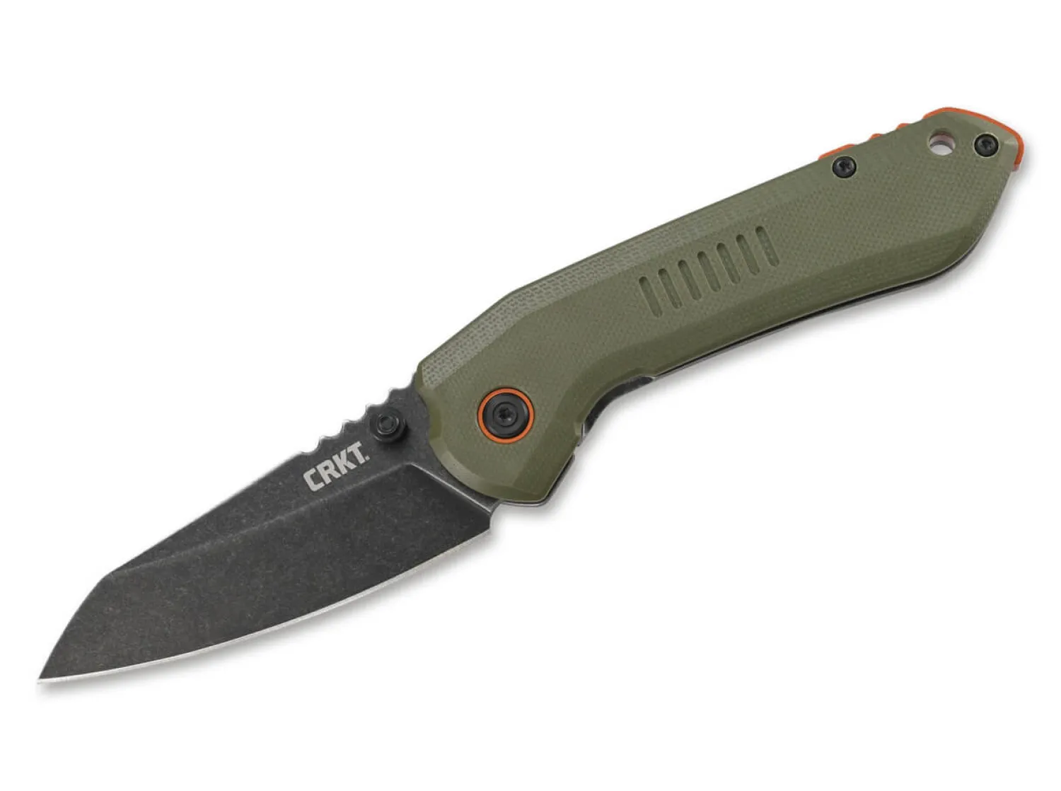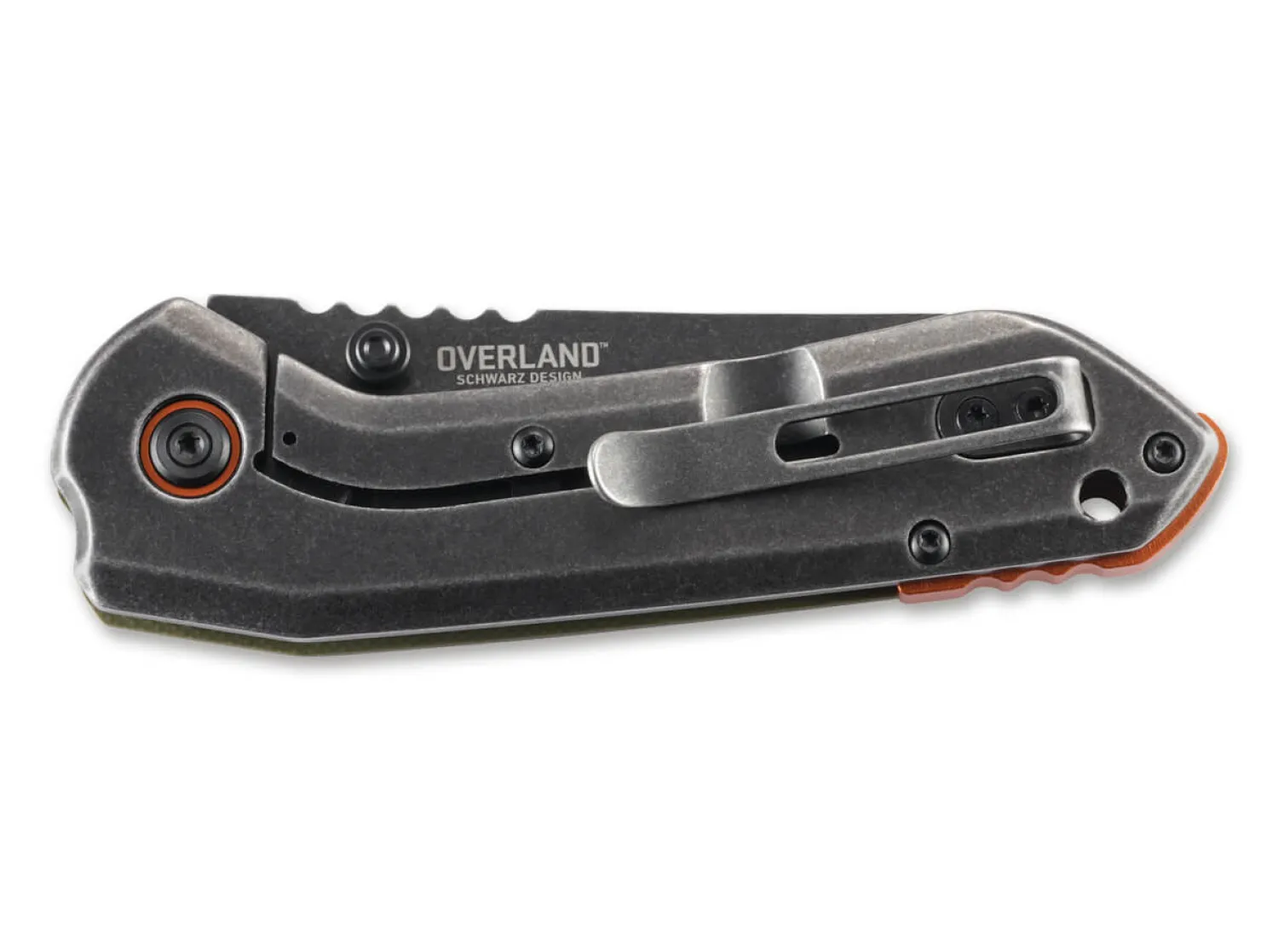 Das von T.J. Schwarz entworfene CRKT Overland ist ein stabiles Outdoor-Taschenmesser für den harten Offroad-Einsatz. Die Sheepfoot-Klinge aus 8Cr13MoV ist mit einem robusten Stonewash-Finish versehen und eignet sich sowohl zum Vorbereiten des Lagerfeuers als auch zum Zubereiten von Mahlzeiten. Sie wird per Daumenpin geöffnet und von einem Edelstahl-Framelock zuverlässig arretiert. Der orangefarben anodisierte Ring um die Klingenachsschraube und der gleichfarbige Spacer setzen einen reizvollen optischen Akzent. Der ergonomisch geformte Griff ist mit einer vorderen Griffschale aus texturiertem grünem G10 versehen. Mit Fangriemenöse und abnehmbarem Clip (Tip-up).