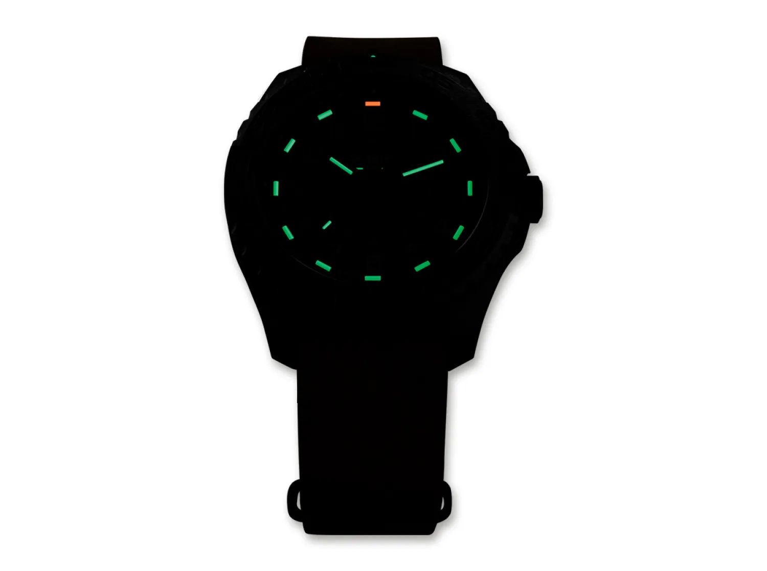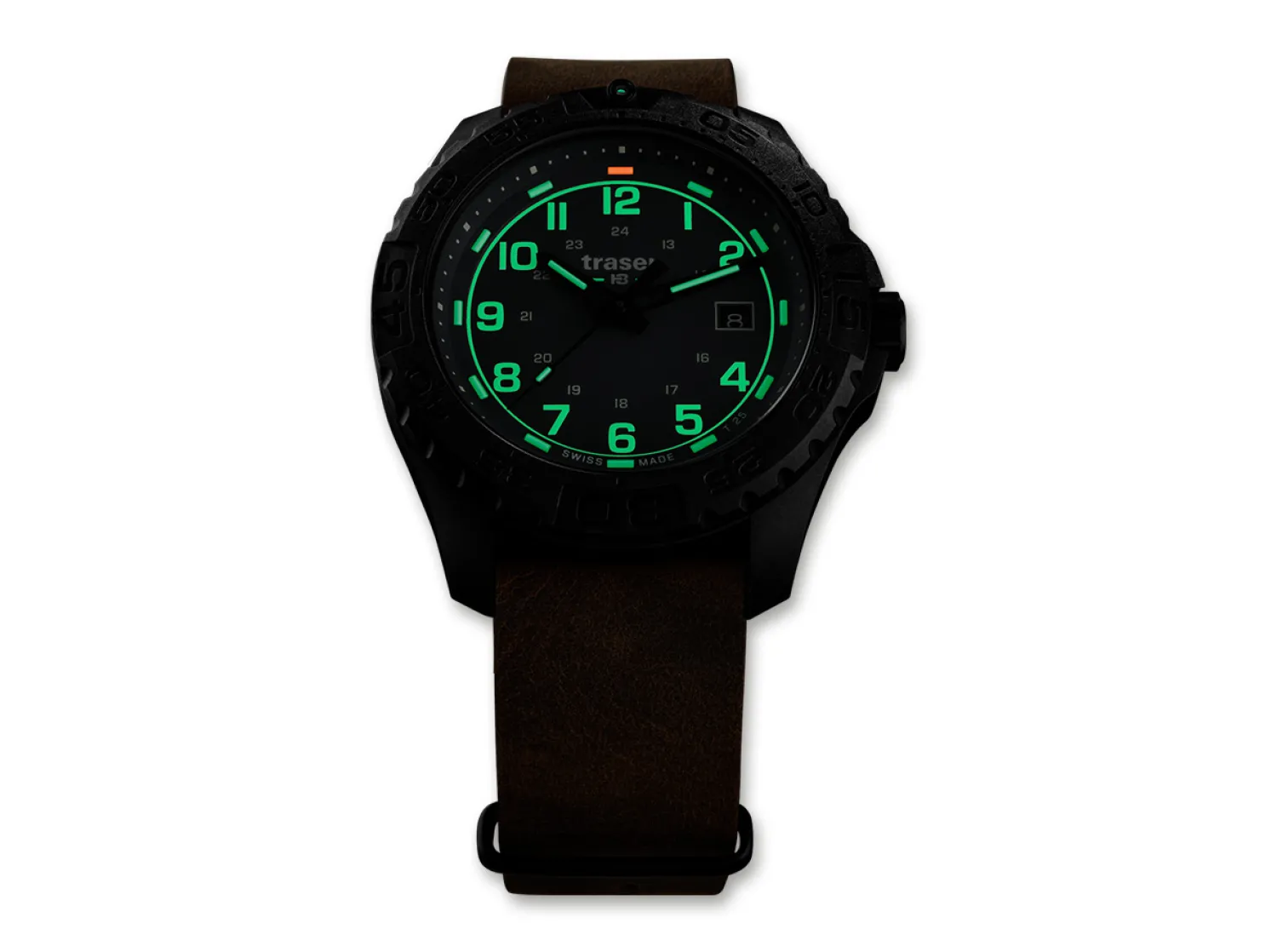 Die Traser P96 OdP Evolution ist der ideale Zeitmesser für Entdecker und Outdoor-Enthusiasten, der bei keinem Abenteuer fehlen darf. Extrem leicht, zäh und robust – diese Eigenschaften charakterisieren die sportliche P96 Outdoor Pioneer am besten. Zusätzliche Robustheit verleiht der P96 ein widerstandsfähiges glasfaserverstärktes Polymer-Gehäuse. Die Ablesbarkeit bei Nacht ist durch die hauseigene Selbstleuchttechnologie trigalight jederzeit gewährleistet.Die Uhr hat einen Durchmesser von 44 Millimetern und ist mit anti-reflektierendem, kratzfestem Saphirglas und einem Original Swiss Made Quarz Uhrwerk ausgestattet. Die grünen Ziffern und Uhrzeiger sitzen auf einem dunkelgrünen Ziffernblatt. Das hochwertige Leder-Armband ist angenehm zu tragen. Die Uhr verfügt über eine Stoppfunktion und ist wasserdicht bis 20 bar oder 200 Meter. Die trigalight Selbstleuchttechnologie erleuchtet Index 1 bis 11 in grüner Farbe und Index 12 in orangener Farbe. Zusätzlich ist die einseitig drehbare Lünette mit Super-LumiNova beschichtet.