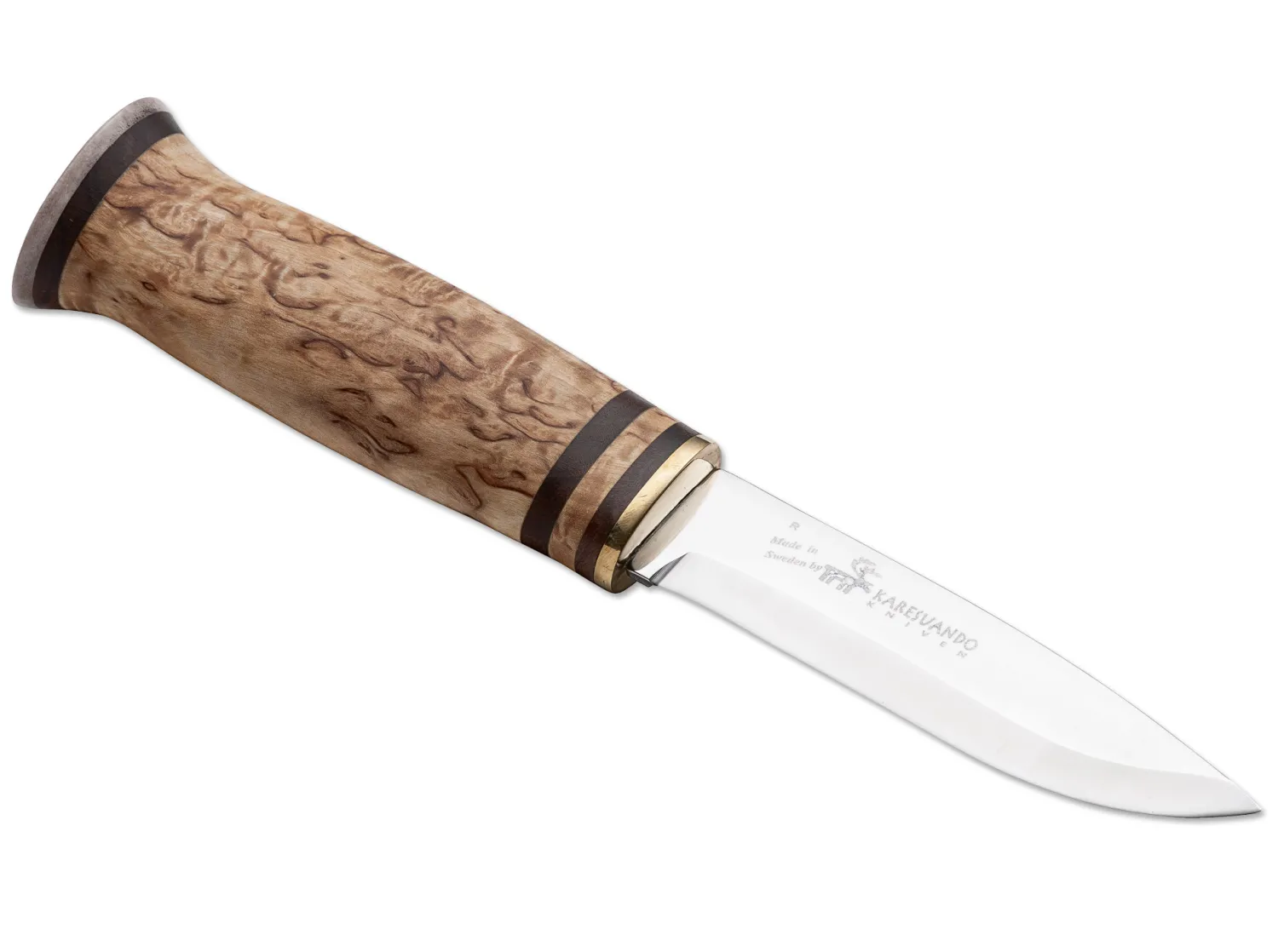 Das Pältsa ist ein handliches Jagdmesser, dessen breiter Griffabschluß gewährleistet, dass man im Bedarfsfall mit dem Handballen zusätzlich Kraft bei der Arbeit einbringen kann. Es ist benannt nach einer Region im nördlichsten Schweden, in der Permafrost und ein nahezu arktisches Klima herrschen. Der Griff aus Maserbirke trägt kontrastierende, dunkle Holzringe, und der Abschluß besteht aus Rentierhorn. Mit klassischer Köcherscheide aus Rindleder, mit integriertem Kunststoffköcher für dauerhaft optimalen Sitz.